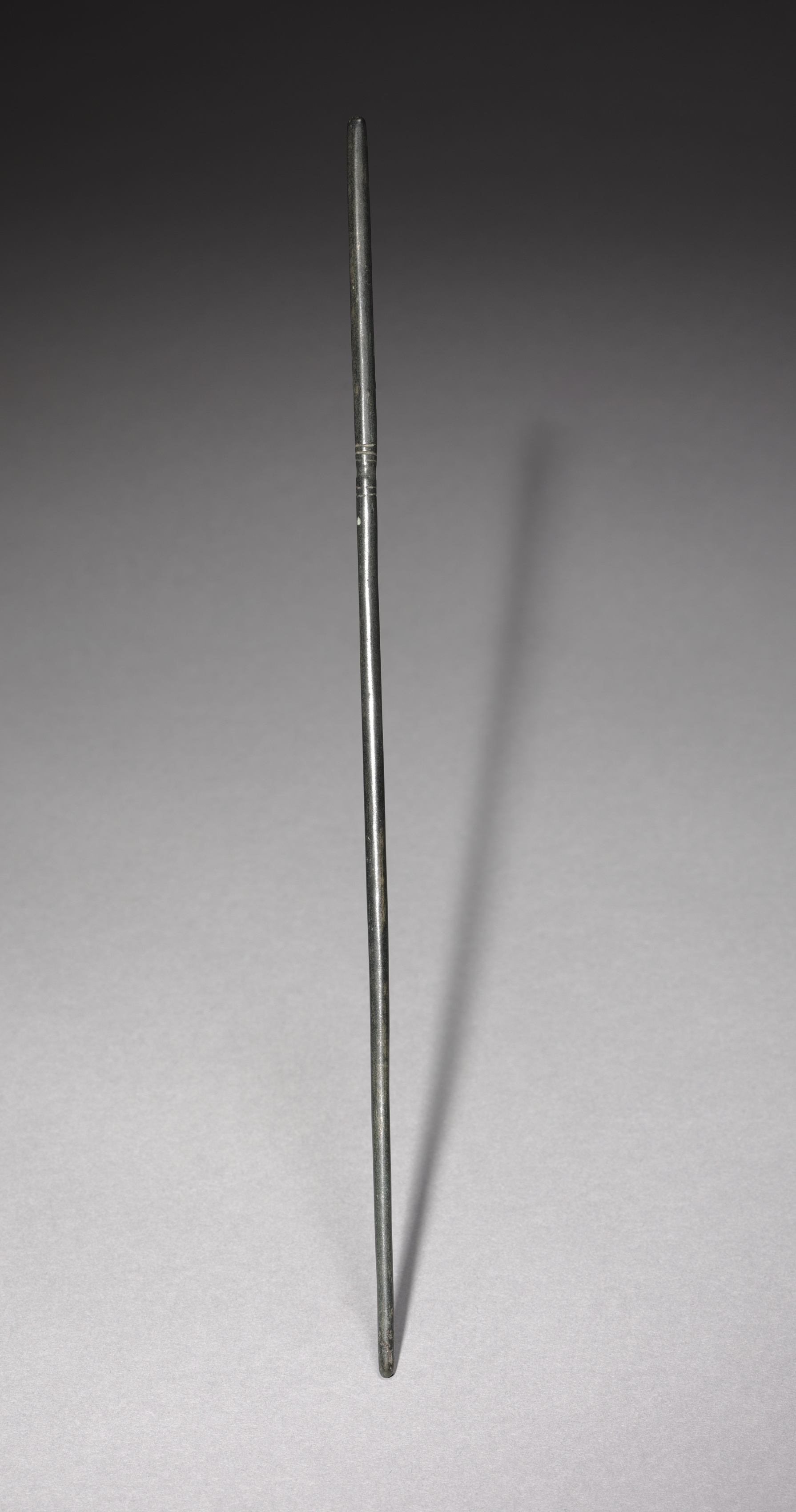 Metal chopstick, likely made of silver or a silver-colored metal, standing vertically on a white surface. The chopstick is long and thin. It tapers to a point on the end. A line design appears around the upper third. A shadow extends to the right. The background is white with a gradient to black at the top. Chopstick by artist.