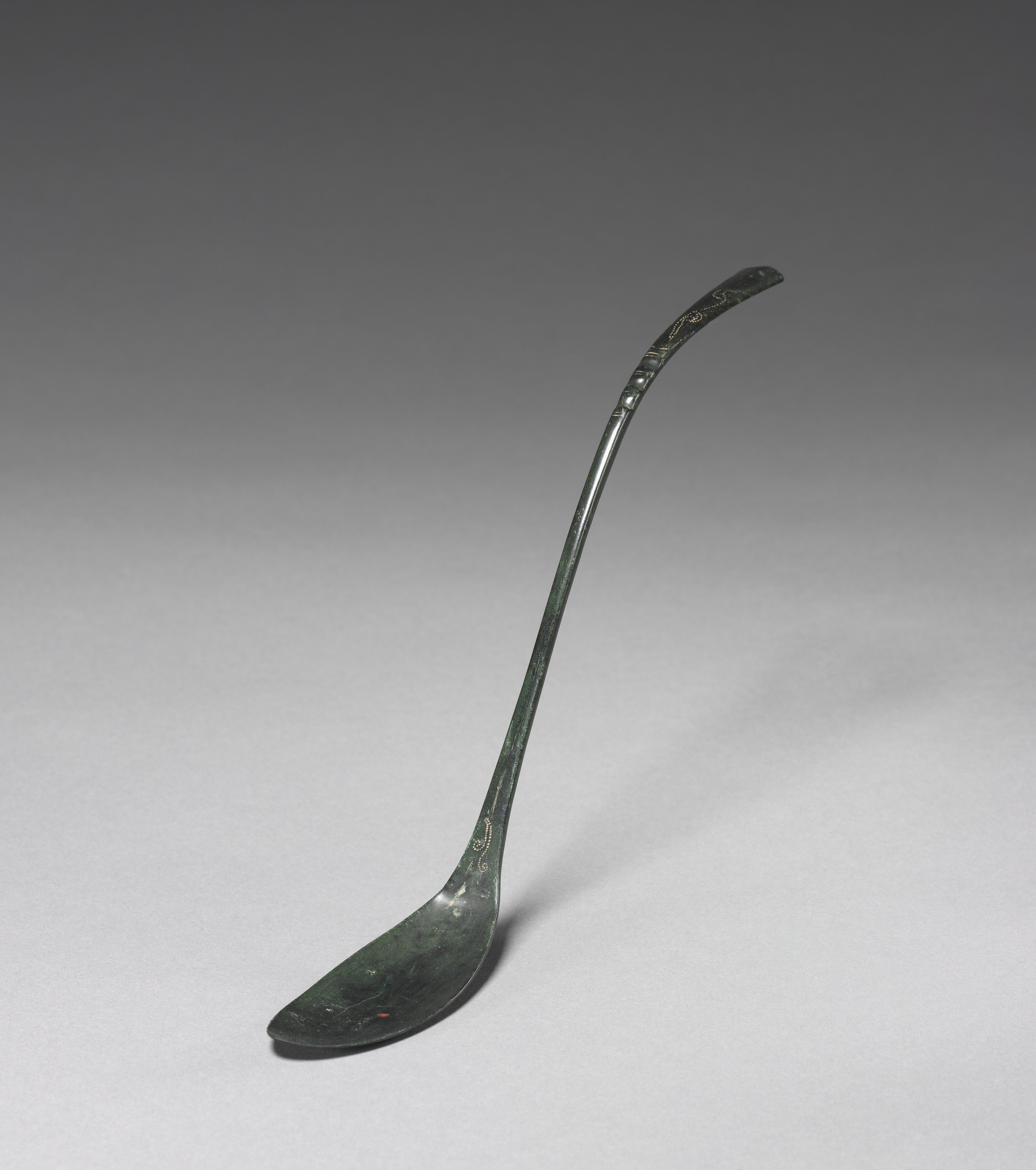 Dark green metal spoon with gold accents, long handle curved upward; bowl of spoon facing down and to the left; gray gradient background. Spoon by artist.