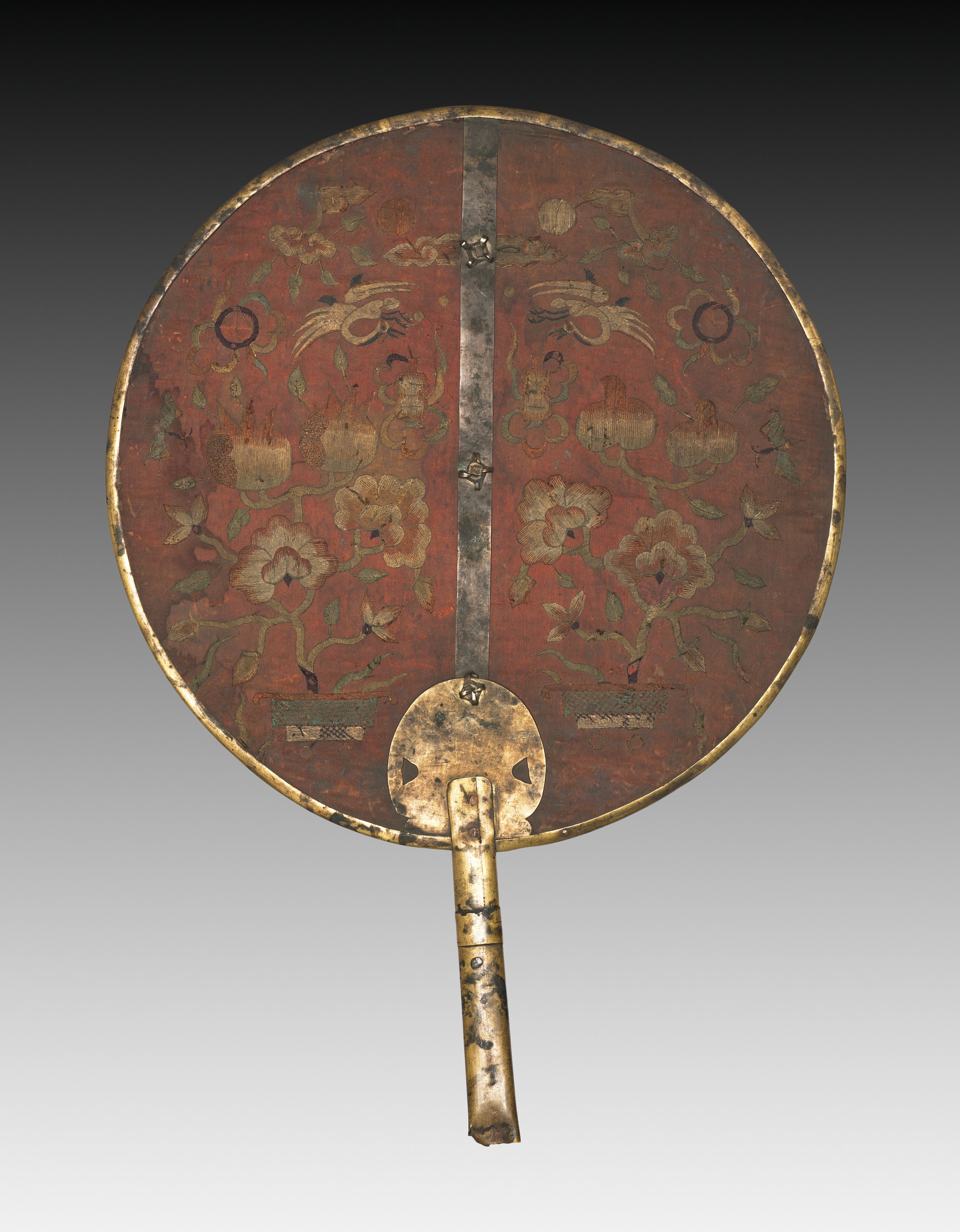 Round fan with a long handle. Fan has a reddish-brown surface with gold floral designs. A thin metal strip runs vertically down the center. The handle and edge of the fan are gold colored.