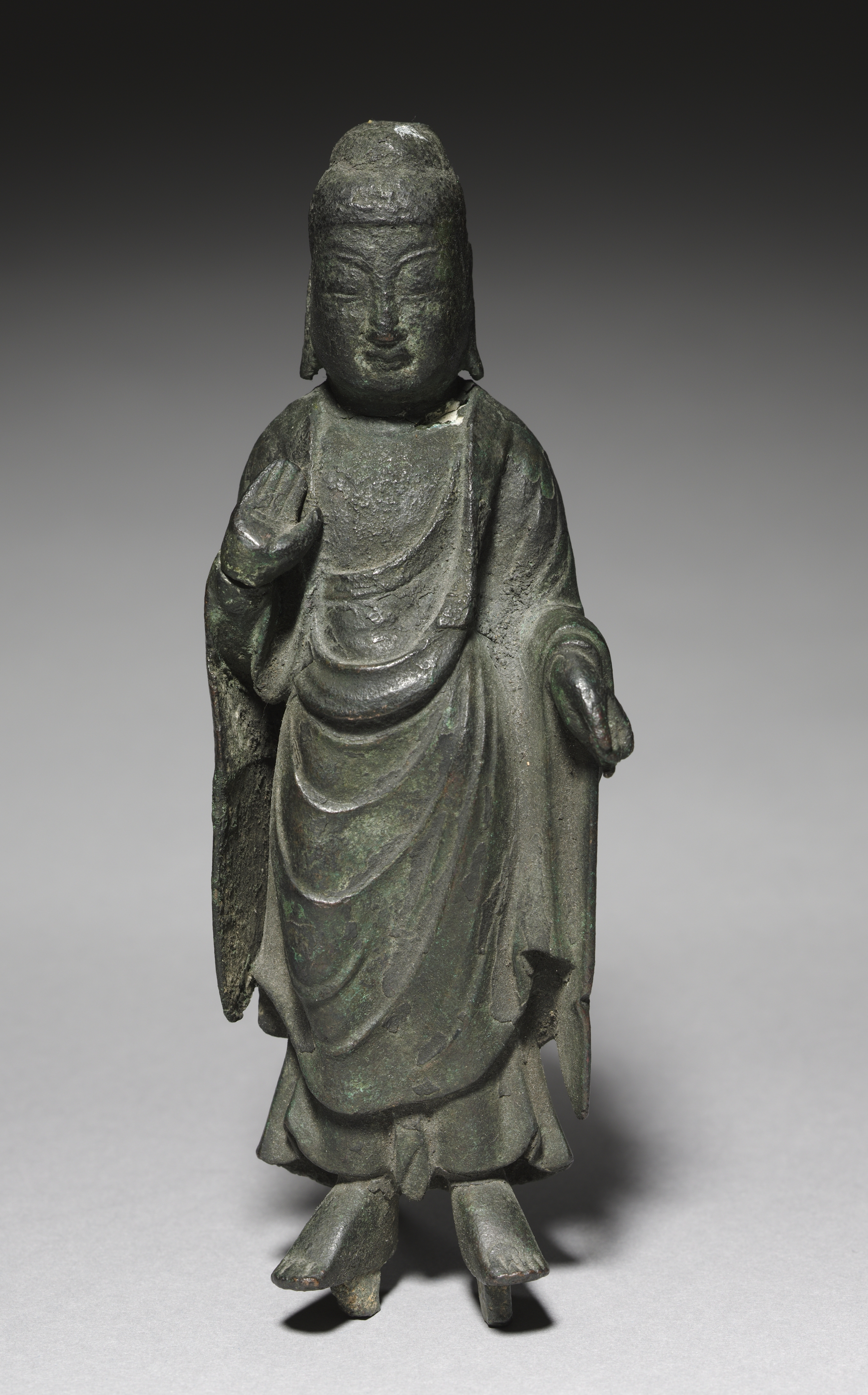 Dark green statue of a Buddha standing with right hand in front of chest and left hand to side. The figure has a smooth face with a subtle smile and closed eyes. The figure's head is shaped with a distinctive curved line on top. The figure wears a long robe with folds and creases. The statue appears to be made of stone or metal. The background is gray with a gradient that gets darker at the top. The Buddha's feet are bare and toes are splayed.