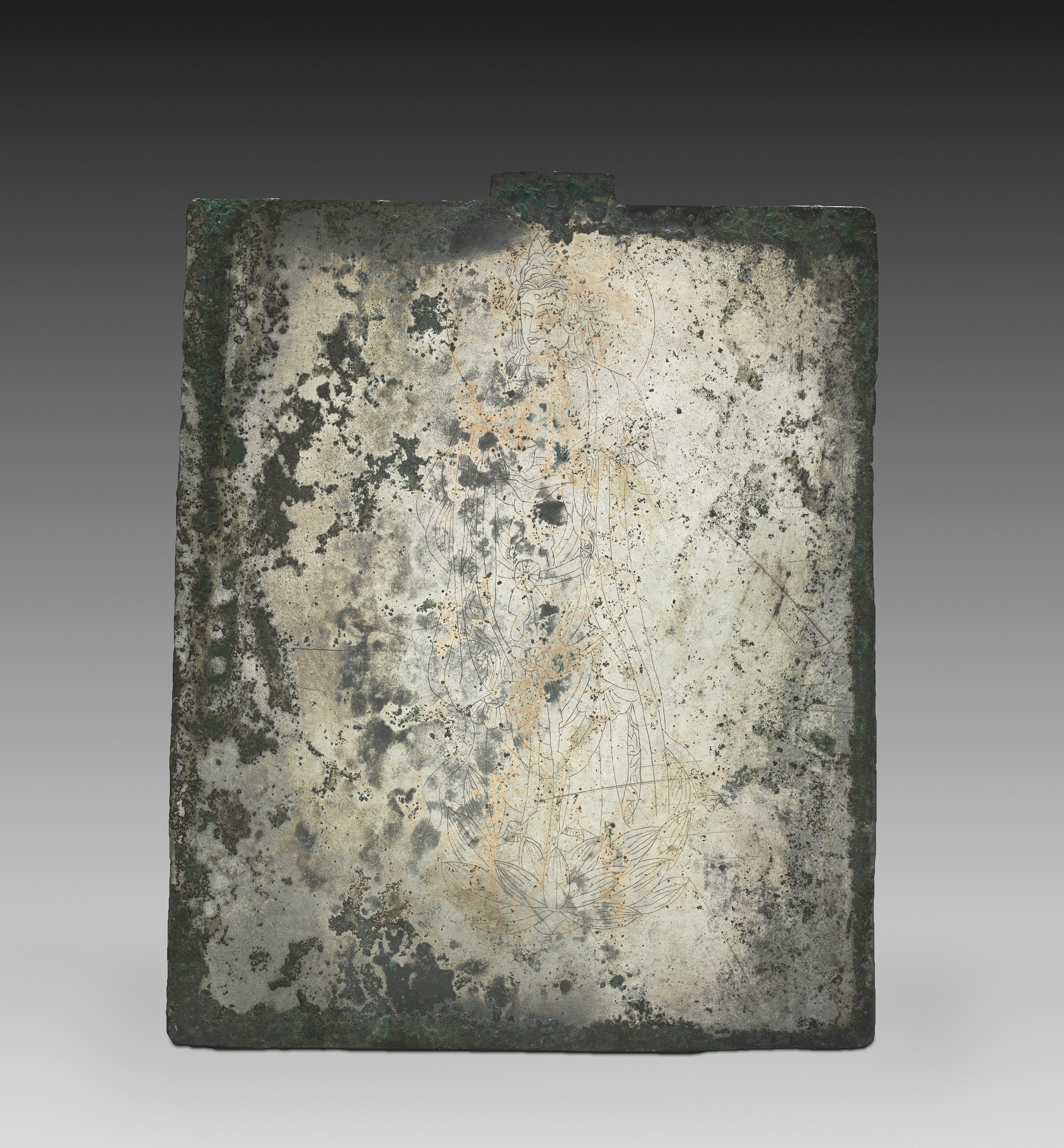 The Mirror with the Image of Avalokitesvara is a square, bronze mirror with a weathered and aged appearance. It has a dark green patina along its edges. The surface displays spots and patches of various shades of gray, white, and black. A faint image of a figure can be seen etched into the surface. The figure appears to be Avalokitesvara, a figure with long, flowing hair and a serene expression. The figure is depicted wearing flowing robes and appears to have multiple arms. The background of the image is a gradient that transitions from dark gray at the top to light gray at the bottom. The mirror sits on a white surface.