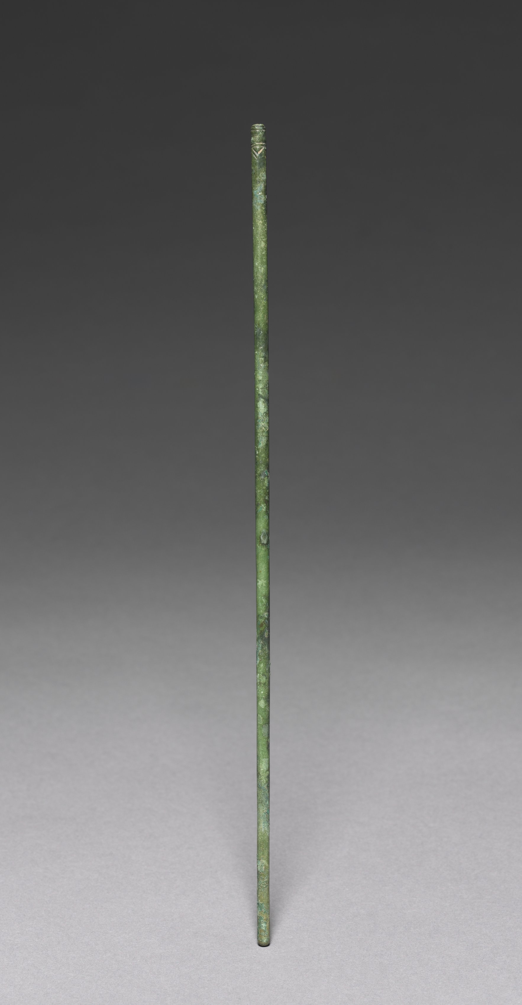Green metal chopstick by artist unknown titled Chopstick. Long, thin, cylindrical green metal object with a tapered end. The surface exhibits a textured, rough appearance with visible signs of wear and aging, including patches of lighter green and darker green patina. A small decorative element is visible at the top. The object is set against a gray background transitioning from dark at the top to light at the bottom.