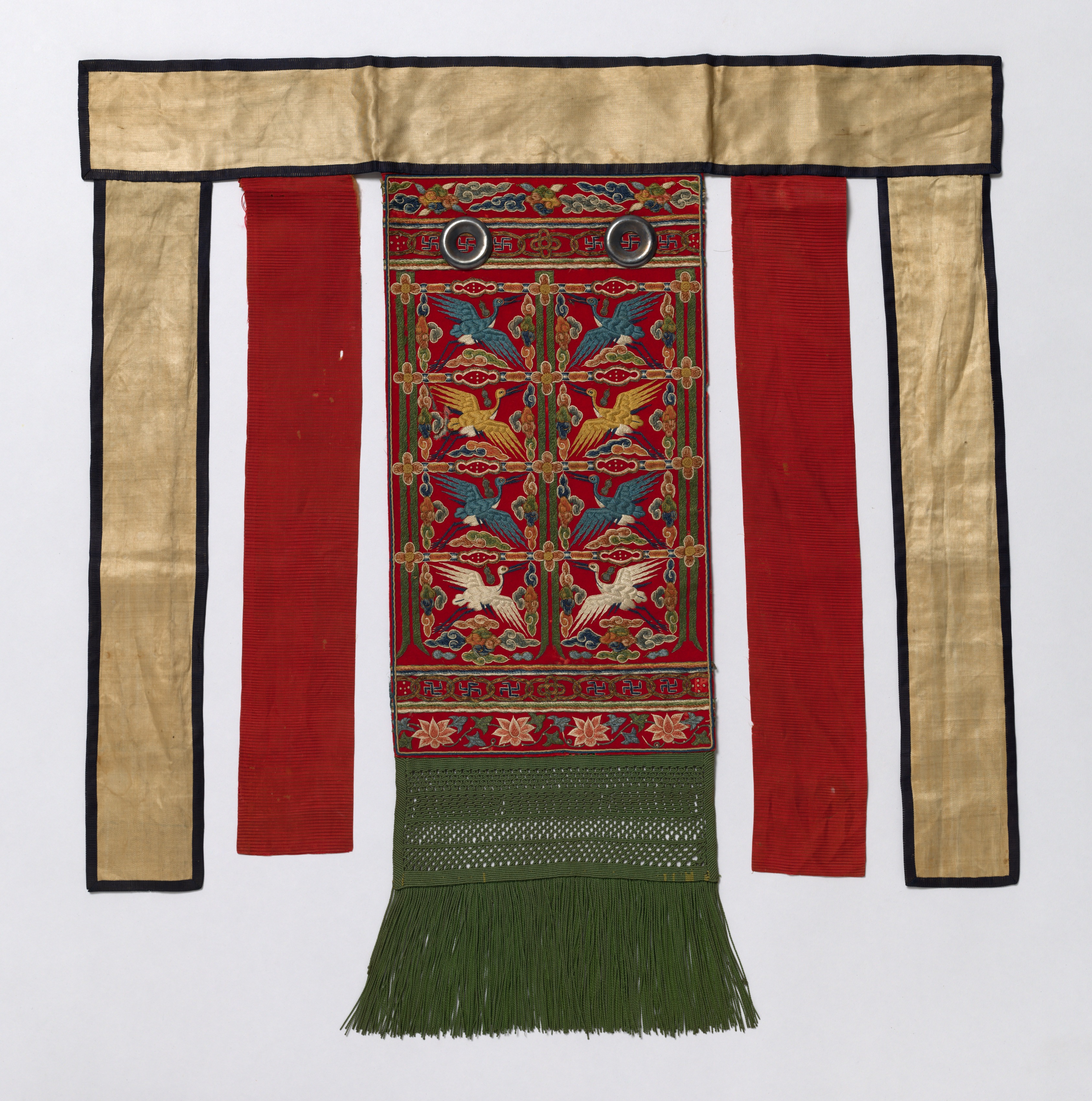Long, rectangular piece of fabric with a T-shape, made of various materials. The top part is wide and beige with a black border. Two long, narrow red pieces hang down on either side. The center is a red embroidered panel with birds, flowers, and other designs. The bottom of the panel has a green fringe. Two circular metal pieces are attached at the top of the red panel. The background is plain white. Title: Back Apron for the Royal Ceremonial Robe.