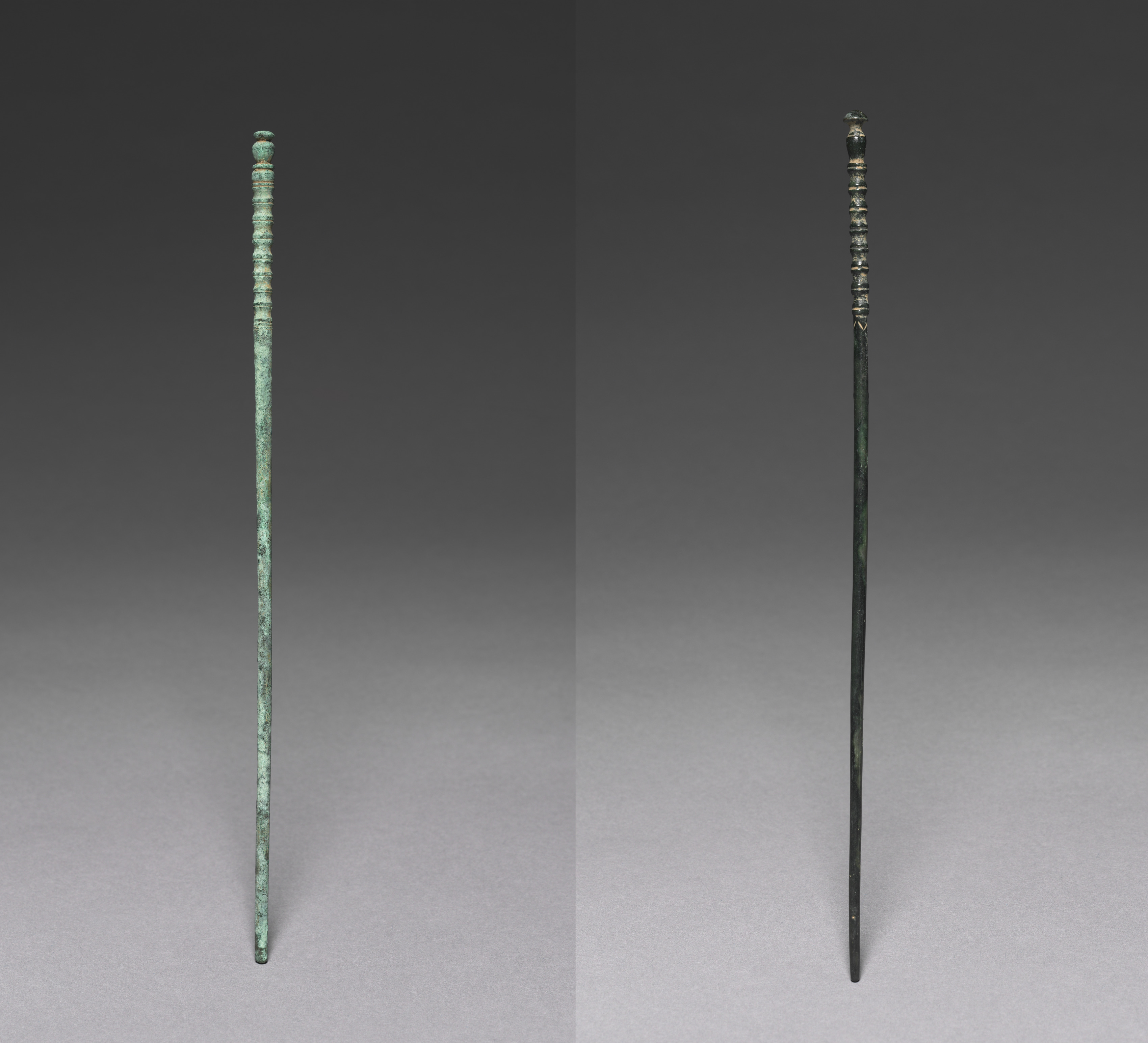 The image shows a pair of ancient bronze chopsticks, titled "A Pair of Chopsticks" by an unknown artist. The chopsticks are long and thin with rounded tips, made of bronze with a green patina. The chopsticks have a series of small, raised rings around the top third of each stick. The chopstick on the left is lighter green with more pronounced rings and a rounded top. The chopstick on the right is darker green with less pronounced rings and a more tapered top. The background is a gradient from dark gray at the top to light gray at the bottom. The chopsticks are displayed side by side on a flat surface, casting a slight shadow. The overall color tone is muted with shades of gray, green, and bronze.
