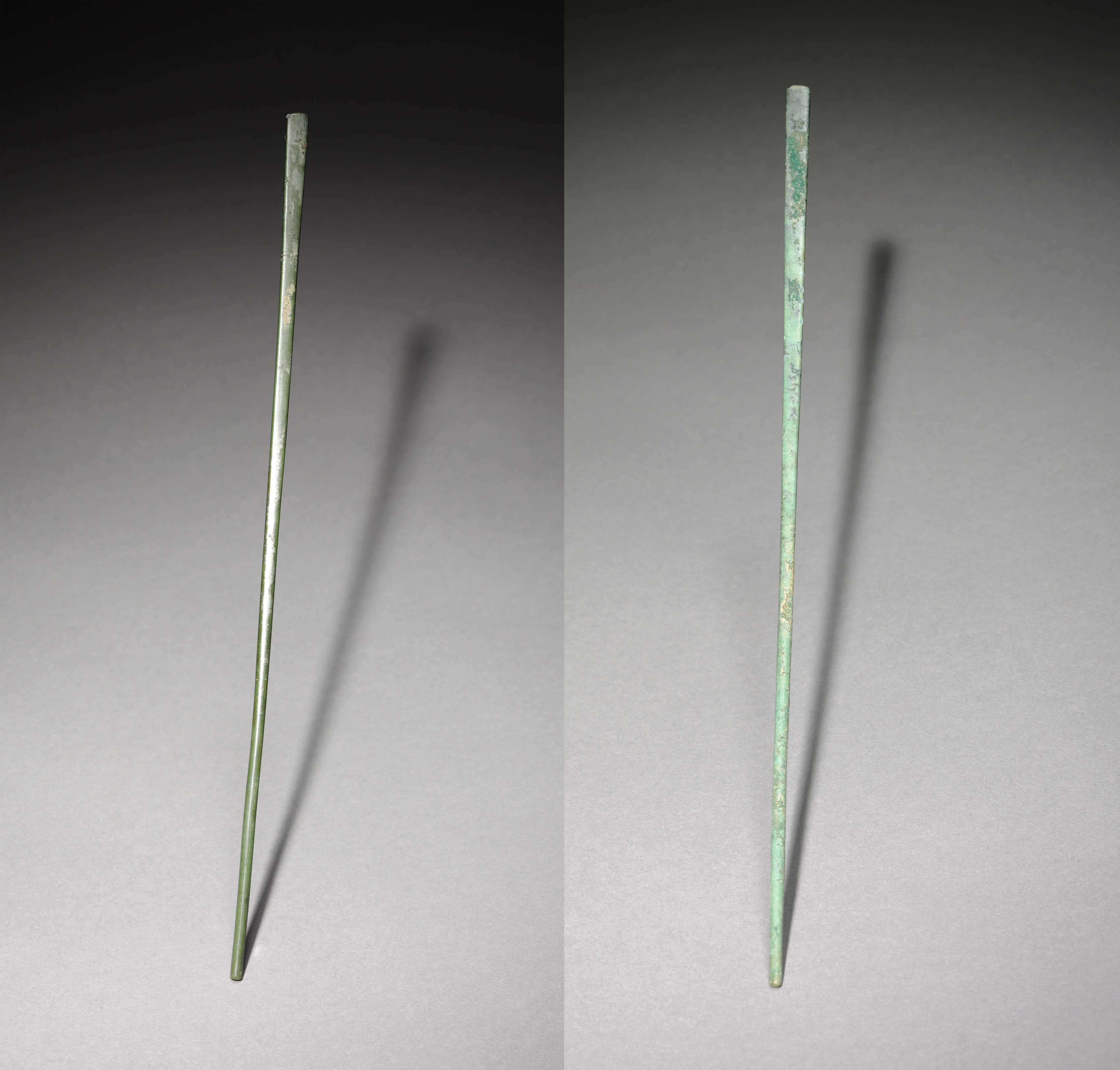 Two long, thin, straight metal chopsticks with a green patina, one on the left with a more uniform green color and the other on the right with a more mottled appearance, both with pointed tips and rounded ends, cast shadows on a gray background. A Pair of Chopsticks.