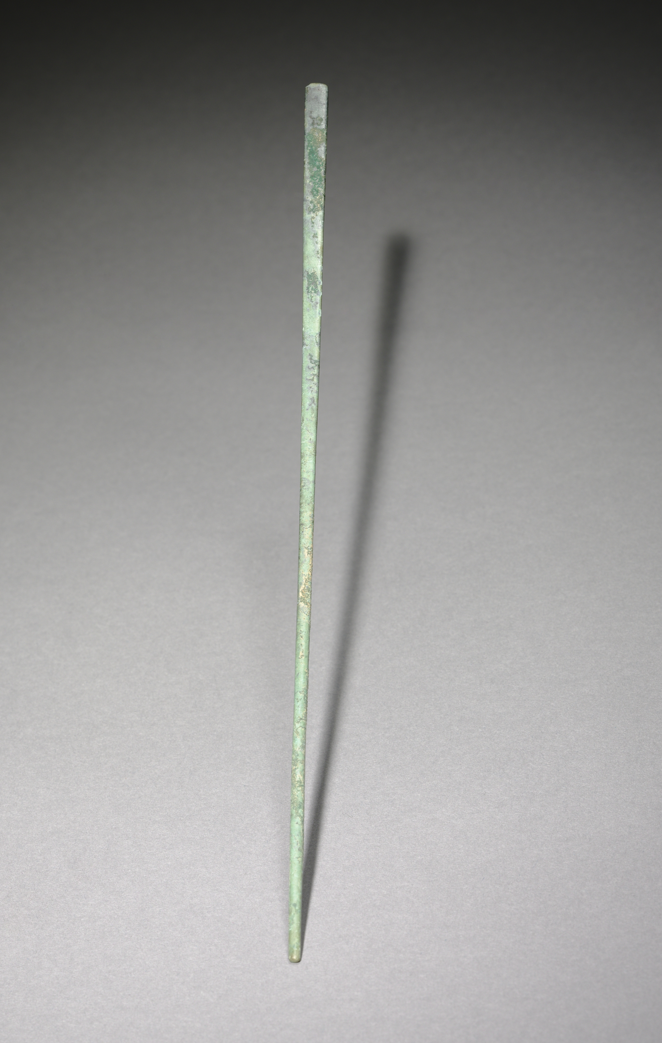 Long, thin, cylindrical object with a pointed end, made of weathered green metal. Object is standing upright. The metal has a rough texture with spots of darker green and brown. The object tapers to a point at the bottom. A shadow extends to the right. Gray background. Title: Chopstick. Artist: unrevealed.