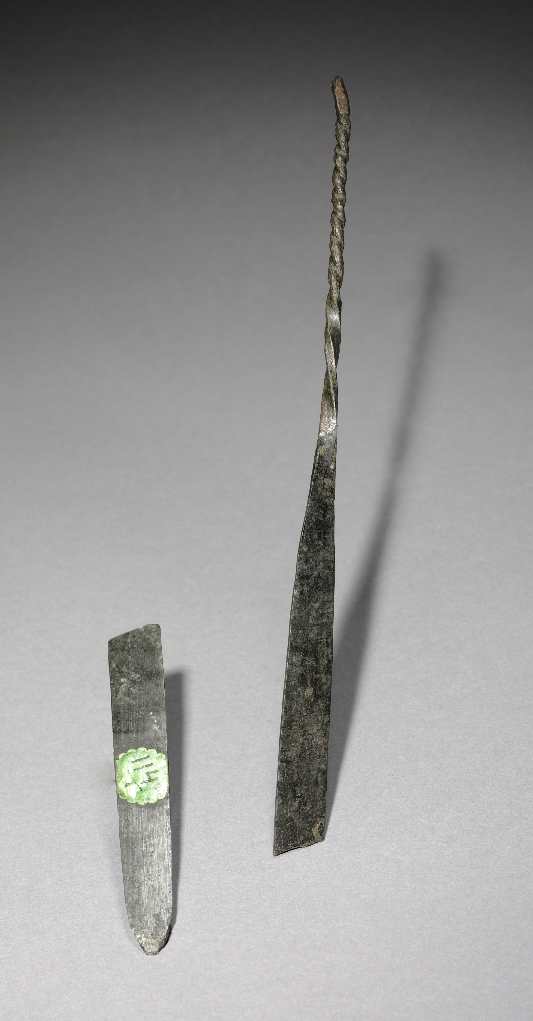 The image shows two metal objects. The object on the left is a small, flat, rectangular piece with a rounded tip. It has a green substance near the top. The object on the right is long and thin, with a twisted top section and a flat, wide bottom section. It is titled 'Dagger' by an unnamed artist.