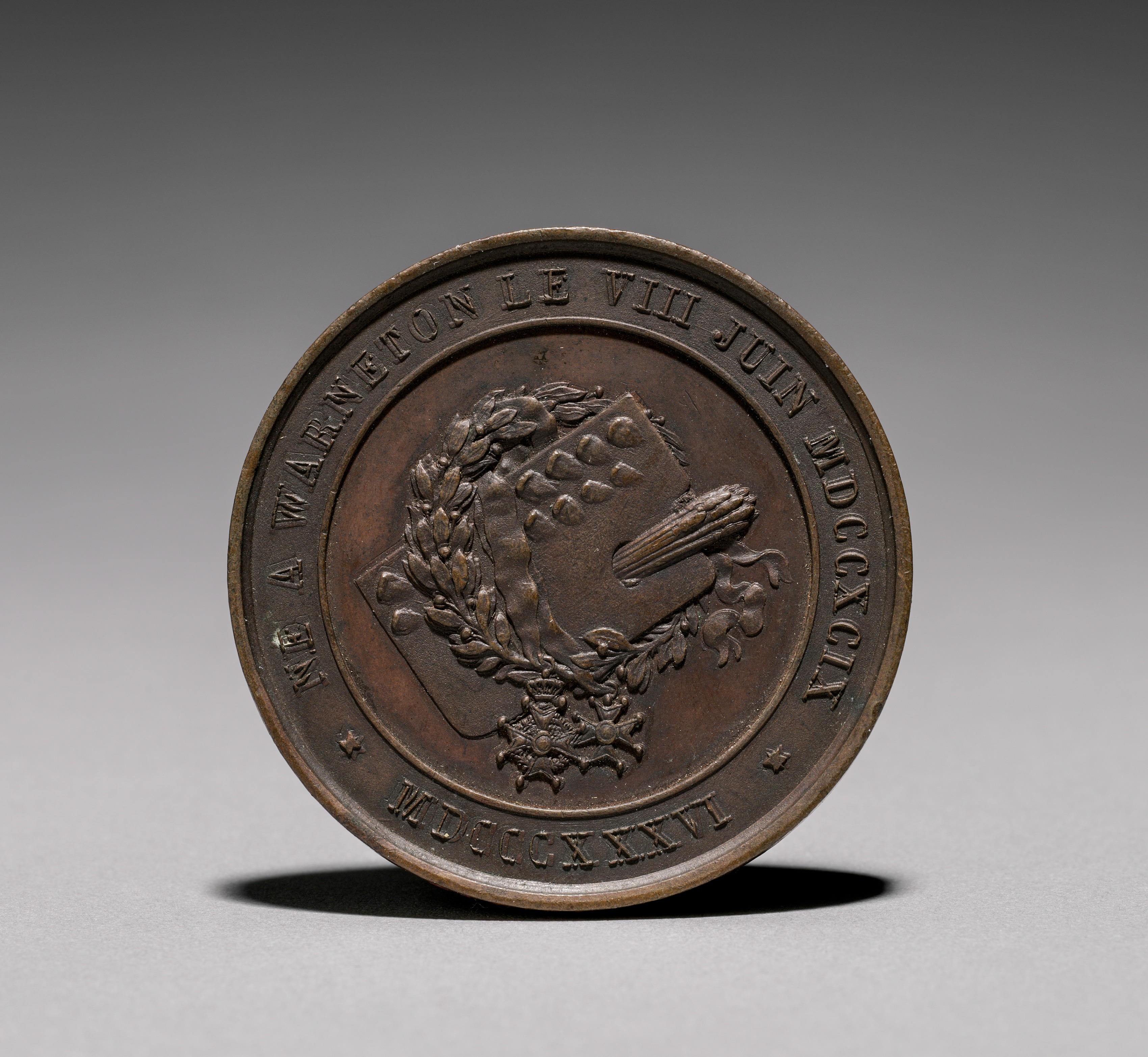 The image shows a medal with a dark brown color and a circular shape. The medal has a raised edge and a raised design in the center featuring a wreath made of leaves. Inside the wreath is a shield with a bird on top and another object below. The top edge of the medal has raised text that reads "ME A WAREN TON LE VIII JUIN MDCCCX" and the bottom edge reads "MDCCCXII". The medal is standing upright on a gray surface with a shadow underneath it. The background of the image is a gradient of dark gray to light gray. The medal appears to be old and worn, with visible signs of aging. The medal is likely made of metal, possibly bronze or copper. The image presents a close-up view of the medal.