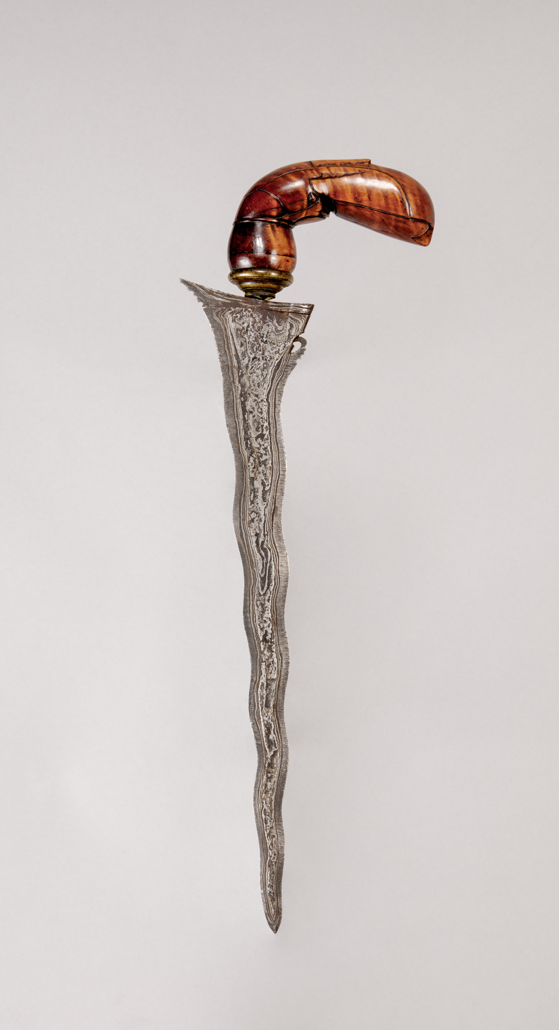 The sword Kris has a long, slender blade with a wavy edge and intricate engravings. The blade is made of silver-colored metal. The hilt is made of polished dark wood, curved and smooth with a golden accent where it meets the blade. The background is a light gray.