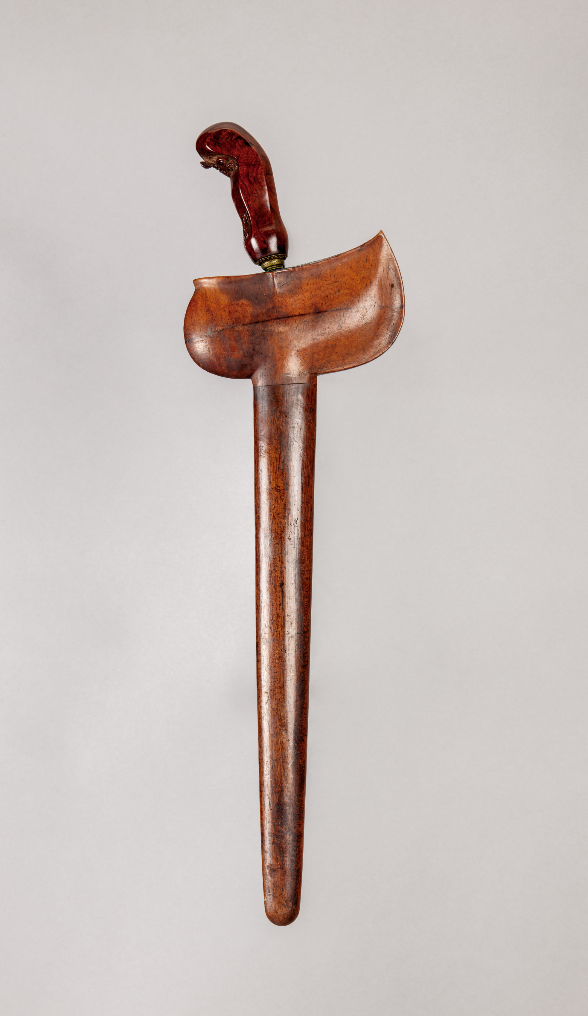 The image depicts a sheathed sword with a wooden handle and scabbard. The scabbard is made of wood, with a long, thin, cylindrical body and a curved top that covers the base of the handle. The handle is also made of wood and features a curved shape at the top. The handle and scabbard are both stained a dark brown color. The scabbard has a smooth surface with some visible scratches and marks. The background of the image is a plain gray color. The overall design and style of the sword and scabbard suggest they may be of Southeast Asian origin, possibly Indonesian or Malaysian. The sword is referred to as a Kris.
