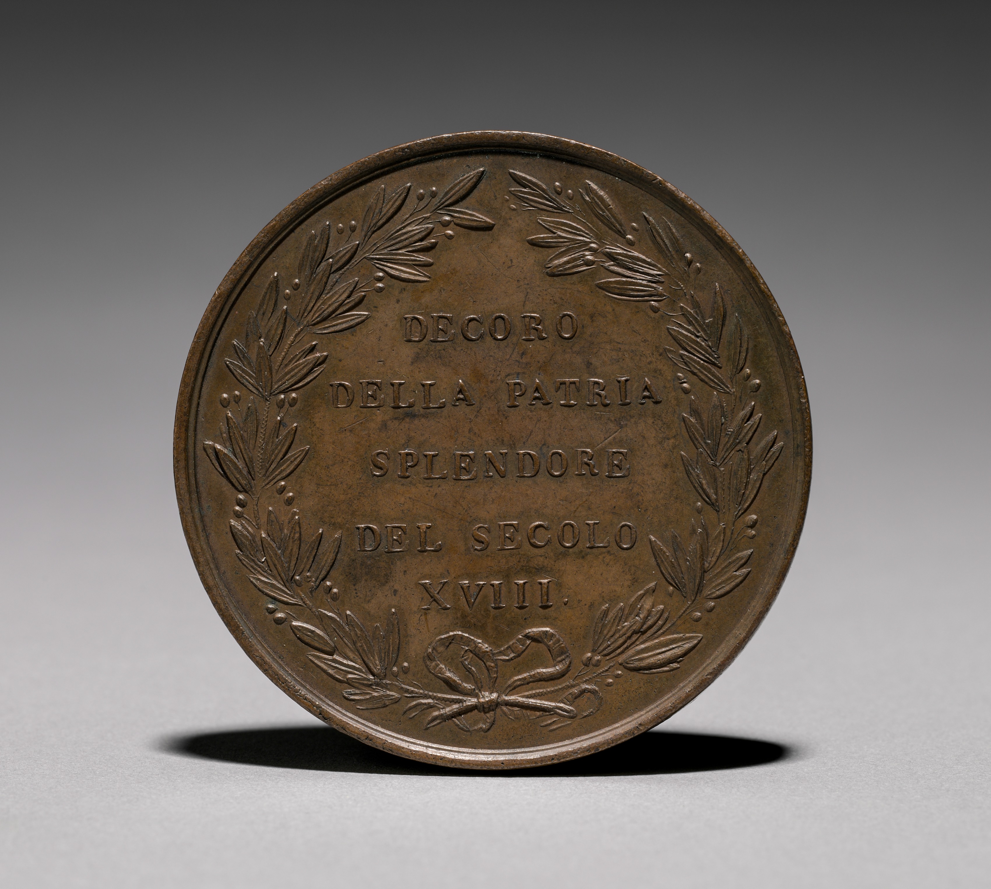 Bronze-colored medal with a circular shape. The medal displays an outer rim with a raised edge. Embossed on the surface are laurel leaves and berries in a wreath design. The wreath frames five lines of text. The words on the top line read "DECORO". The second line reads "DELLA PATRIA". The third line reads "SPLENDORE". The fourth line reads "DEL SECCOLO". The fifth line reads "XVIII". The wreath and bow design appear embossed. The background is a grey gradient.