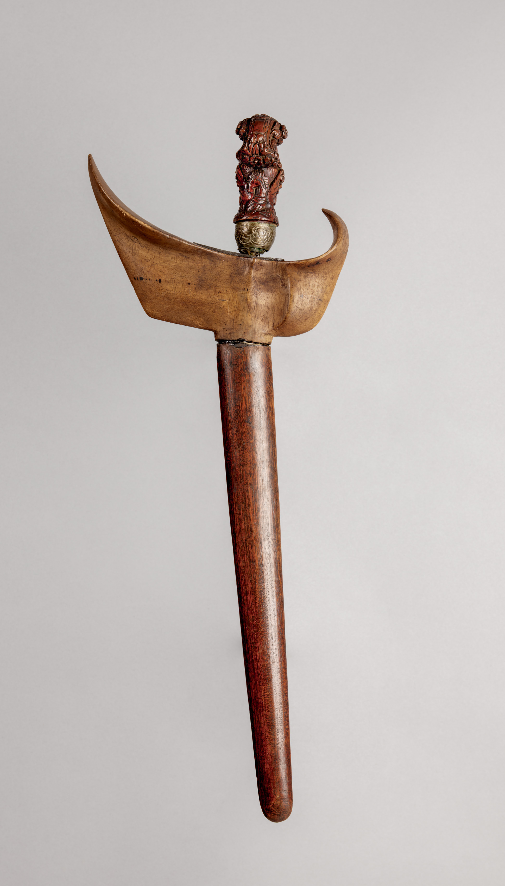 Sword (Kris) with a long, dark brown wooden handle, slightly rounded at the end. The handle is topped with a decorative piece featuring a red and black design. A small, round silver-colored metal piece separates the handle from the blade. The blade is made of a lighter-colored metal, curved into a wide, crescent shape that opens upwards. The two ends of the blade curve outward. The background is a plain gray color.