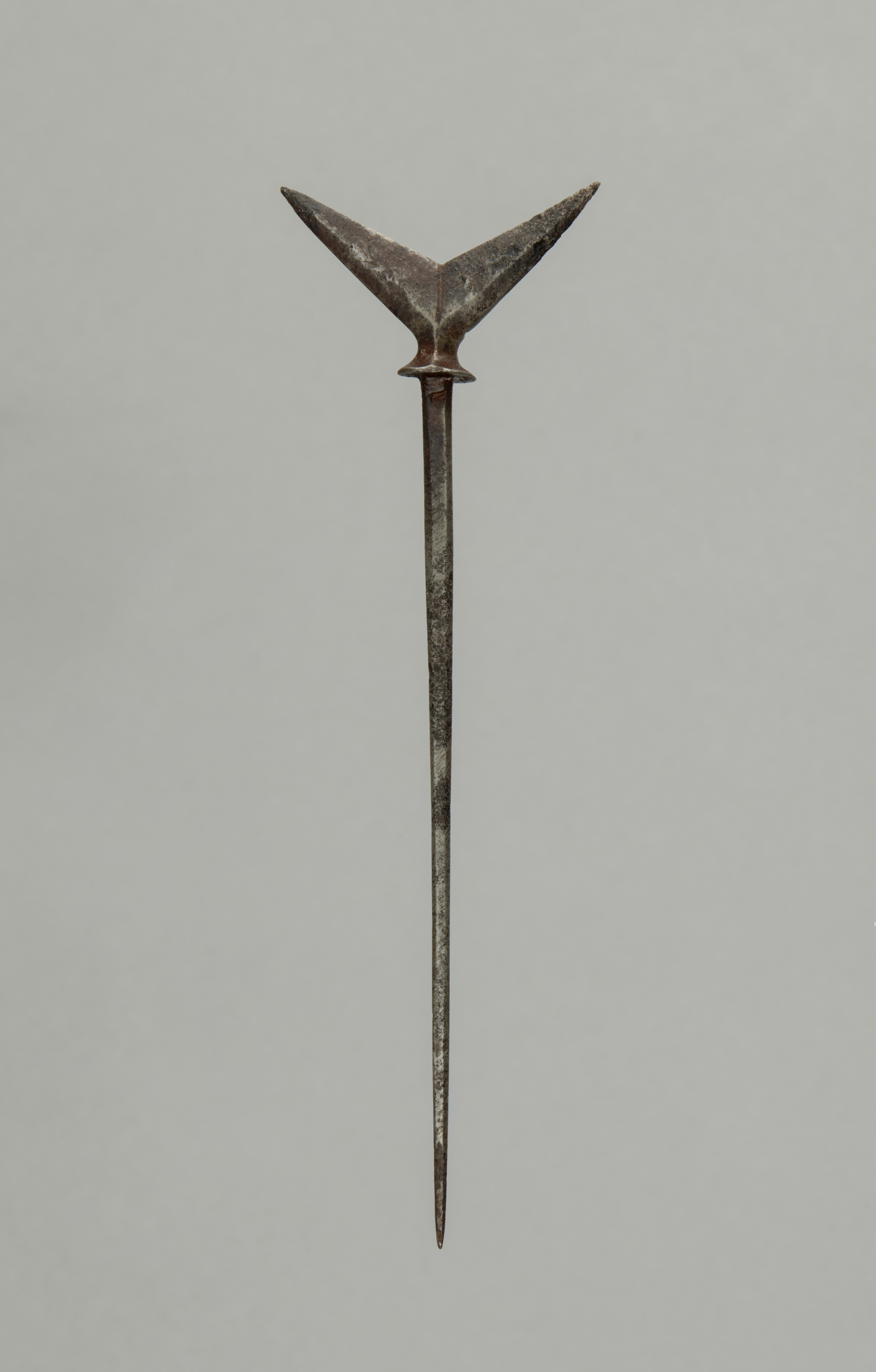 Metal object, Arrow Point, by artist not specified, features a long, thin, pointed shaft made of dark gray metal with a weathered appearance. The shaft is narrow and tapers to a point at the bottom. At the top, it widens into a Y-shaped formation with two pointed prongs. A small, circular collar connects the prongs to the shaft. The background is a solid light gray color.