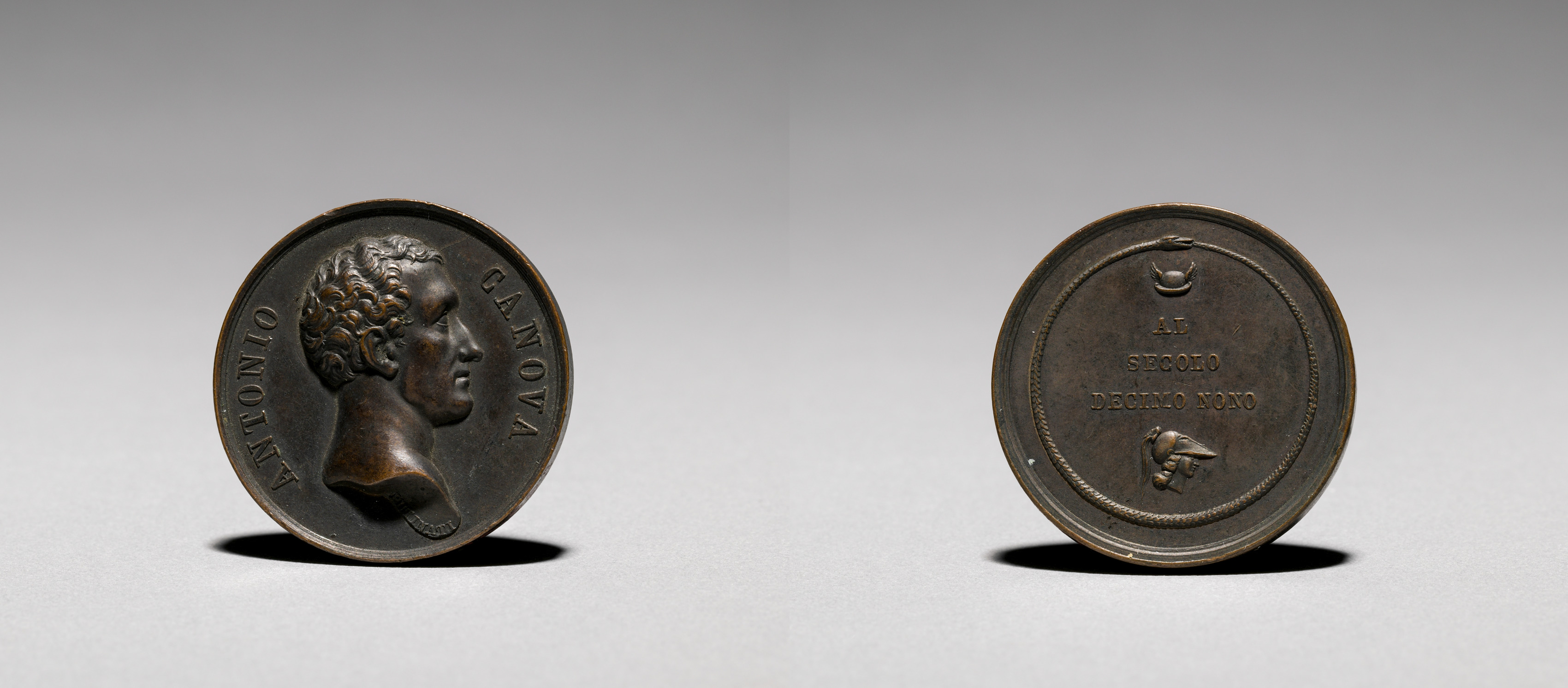 Bronze medal with dark patina. The medal has two sides. One side has a raised profile portrait of a man with short curly hair facing right. The man's name "ANTONIO CANOVA" is written in raised letters on either side of the portrait. The other side has a raised border of small dots. Inside the border, there are four lines of raised text that read "AL SECONDO DECIMO NONO". Above the text is a small raised figure of a winged creature. Below the text is a small raised figure of a panther or lion. The medal is displayed on a light gray background with a shadow underneath.