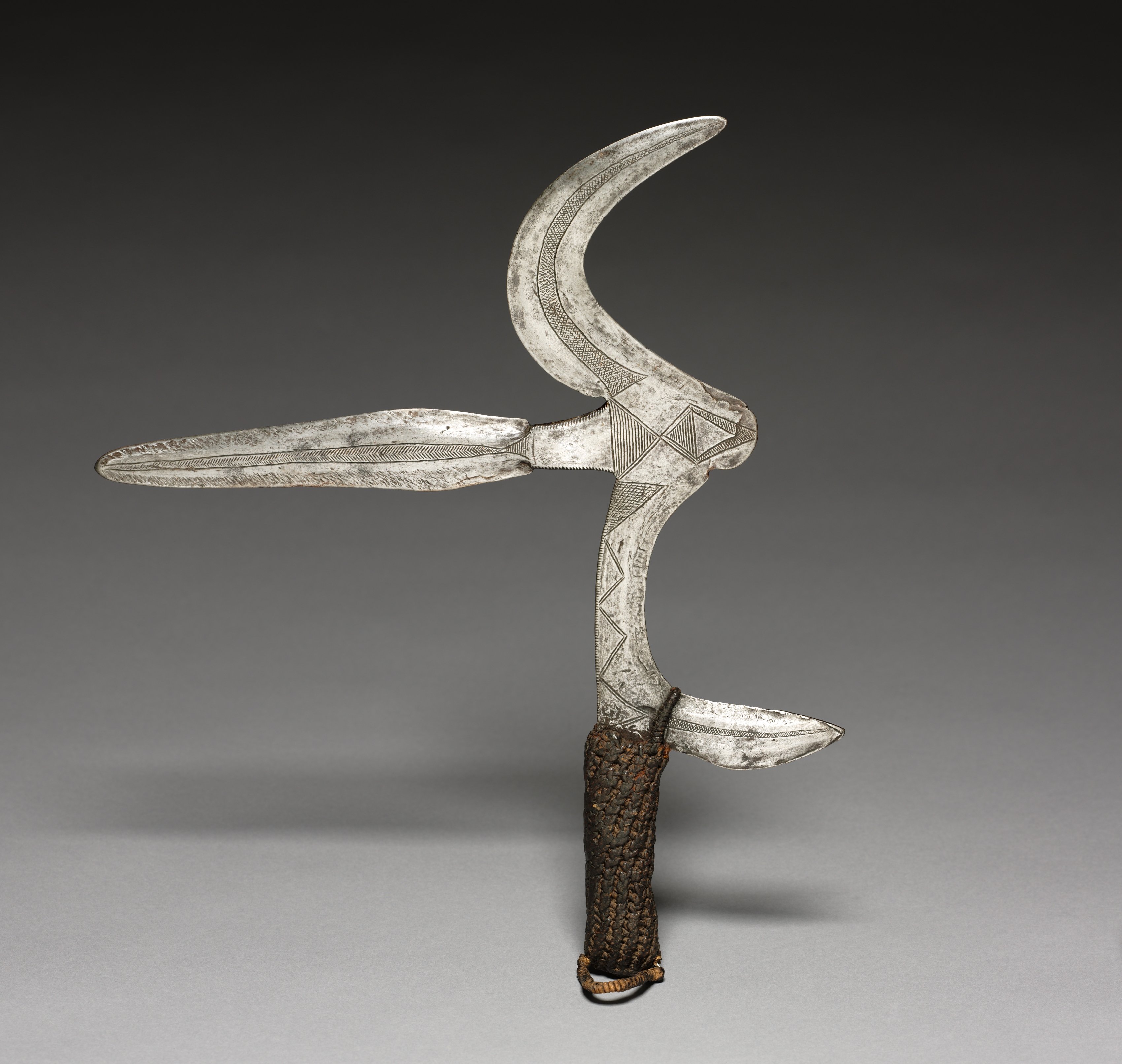 The Throwing Knife by Songe. This object is a throwing knife with a brown handle wrapped in woven material and a metal blade that is silver in color. The blade has a long, thin, curved top section resembling a crescent moon and a shorter pointed bottom section. The blade features engraved geometric patterns. A cord wraps around the base of the blade where it meets the handle. The handle has two small circular decorations at the bottom. The background is a gradient from dark gray at the top to light gray at the bottom. A shadow is cast to the left of the object.
