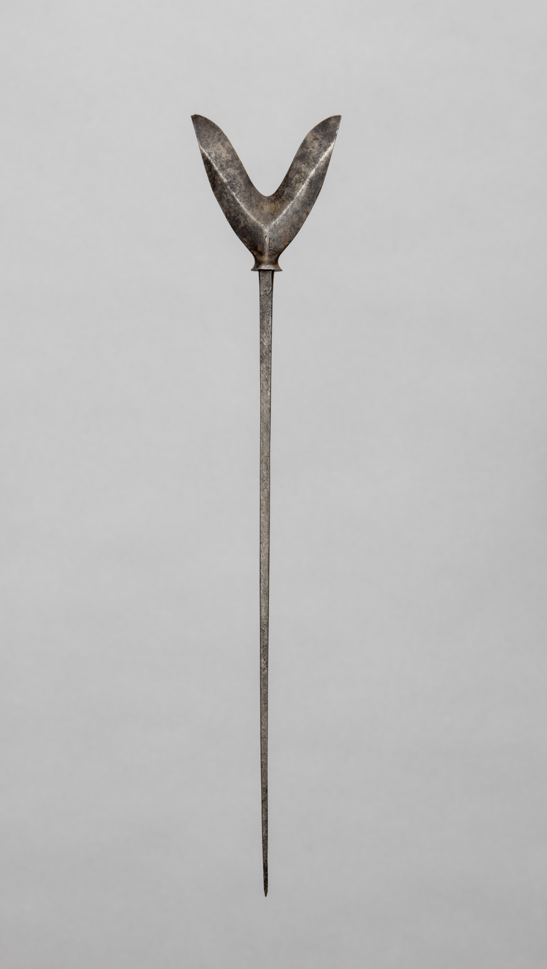 Metal object with long thin shaft, dark gray with lighter gray and brown patches; top of shaft widens into two prongs angled slightly outward; prongs are triangular with sharp tips; short raised band under prongs; light gray background. "Arrow Point" by Unidentified Artist.