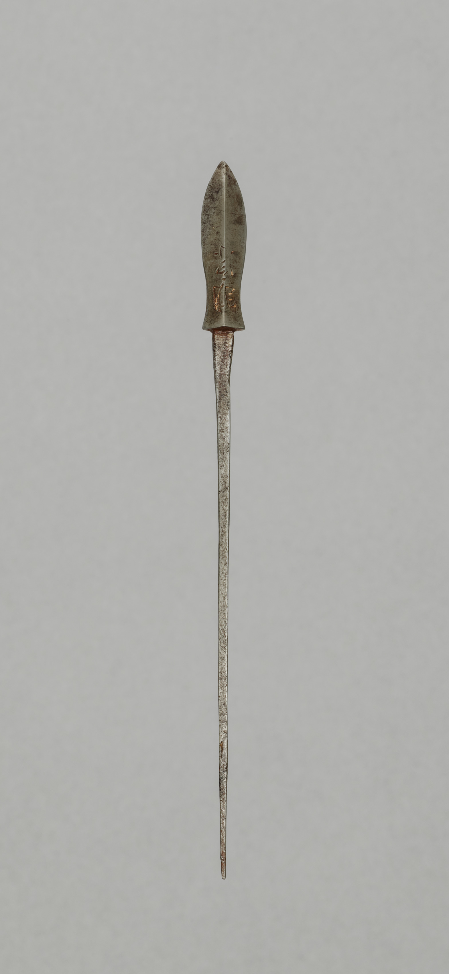 Metal object with a long, thin blade and a pointed tip, resembling a dagger or spearhead; the blade is slender and elongated with a tapered end; a metal handle or hilt; a leaf-shaped metal piece at the top; gray background. Title: Arrow Point Artist: not specified.
