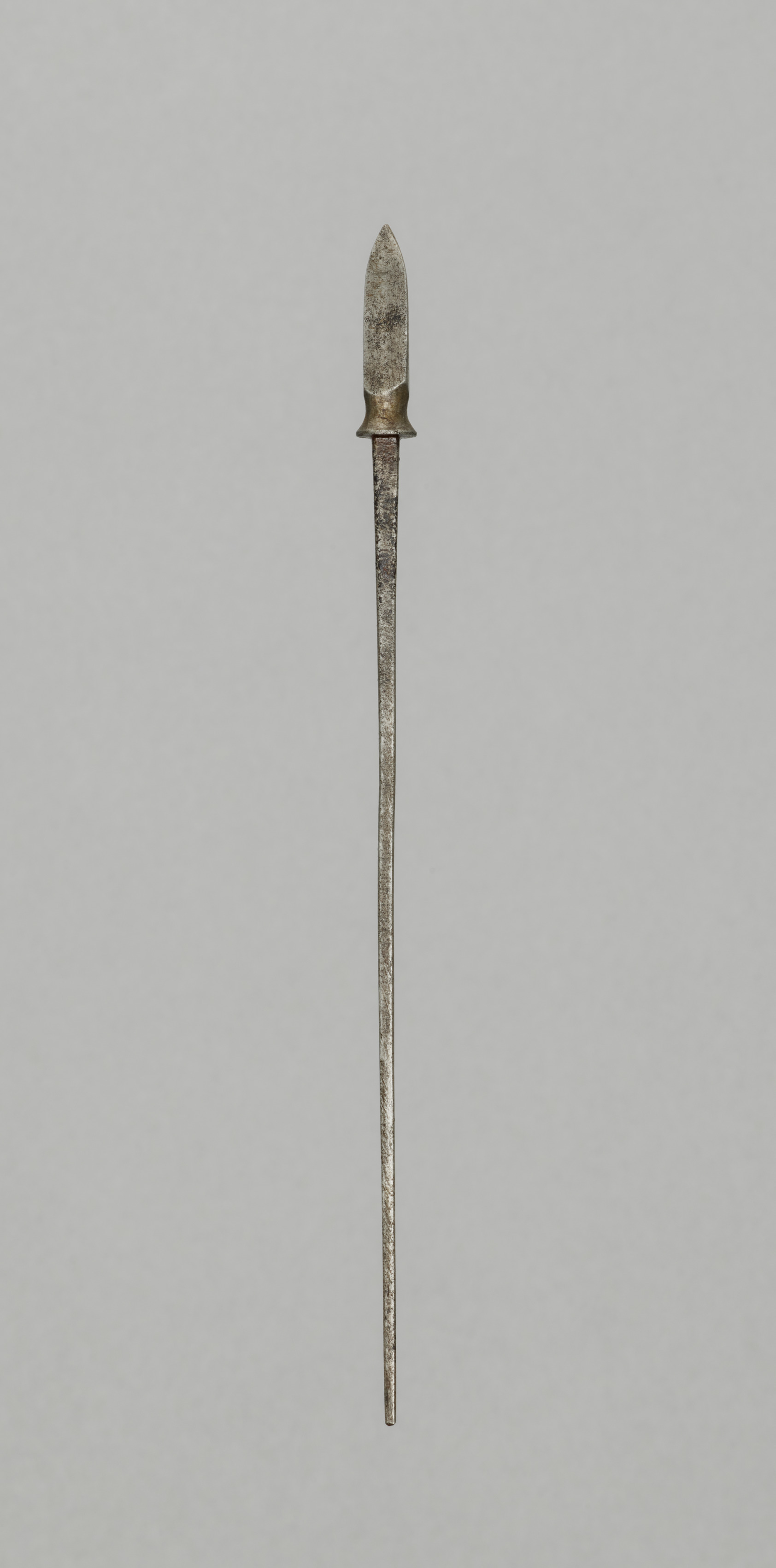 The image depicts Arrow Point by artist Unidentified. A long, thin metal object with a pointed tip. The object appears to be an arrowhead or similar pointed tool, with a small gold-colored piece near the top. The metal is silver and has a textured appearance. A long shaft extends from the base of the gold piece to the bottom of the image. The background is a solid light gray color.
