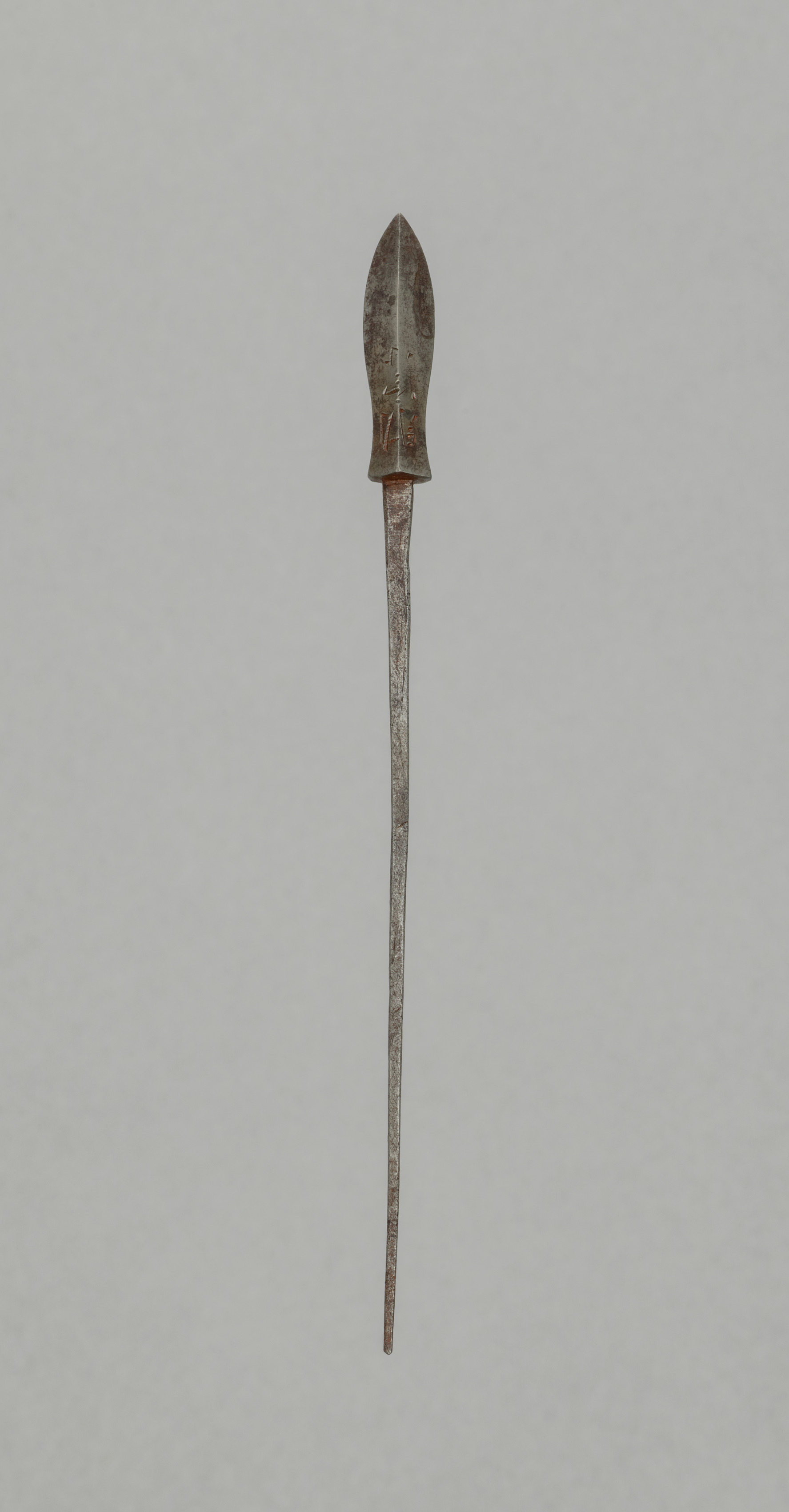 The image shows a long, thin, metal object with a pointed end and a wider, more rounded top. The object titled "Arrow Point" by an unmentioned artist, is made of metal and exhibits a grayish color with visible signs of wear and tear, including dark spots and discoloration. The object is long and thin, tapering to a point at the bottom. The top portion is wider and more rounded, resembling a leaf or a spearhead. The background of the image is a solid light gray color.