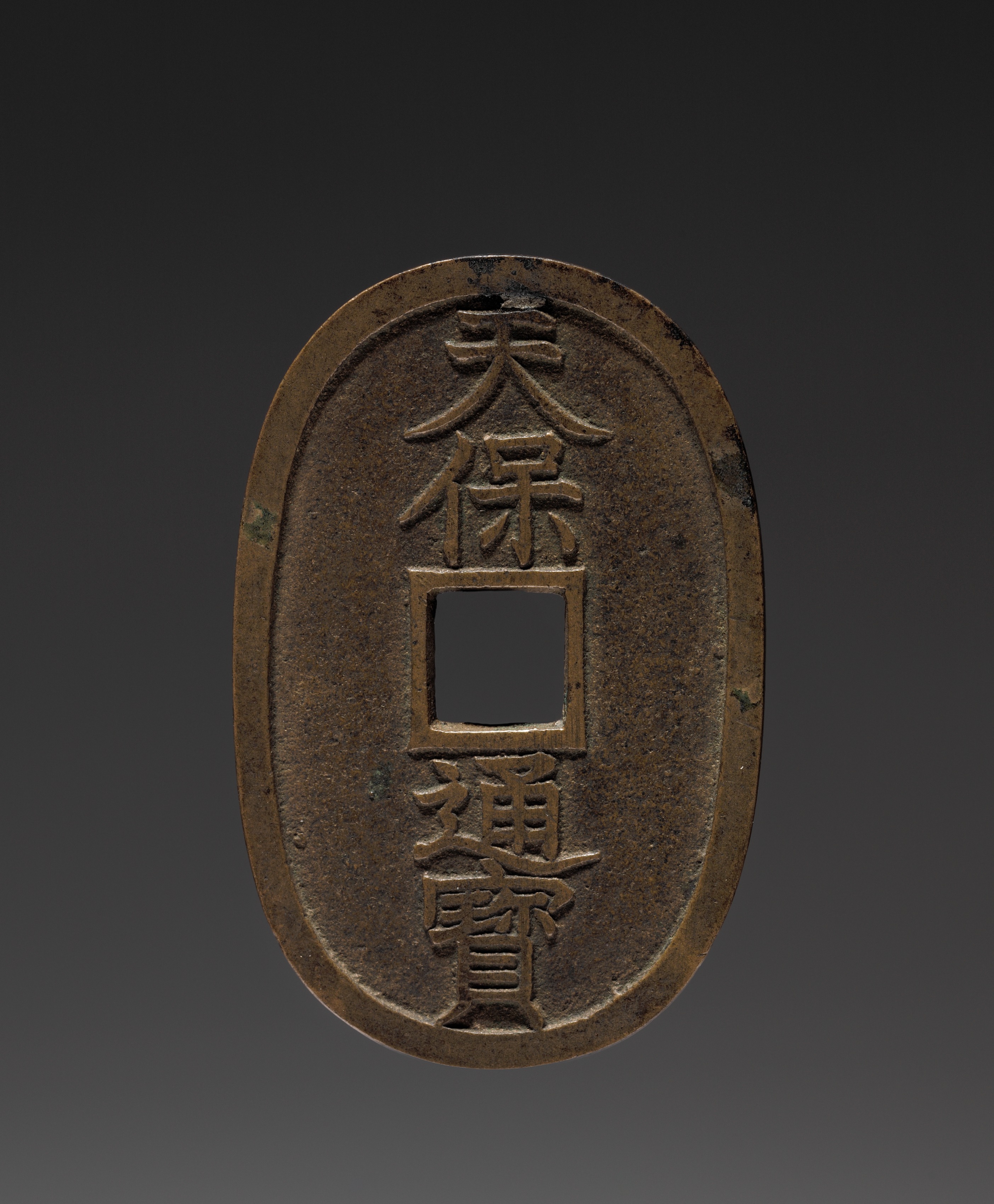 The Tenpō Tsūhō Coin by an unknown artist shows a weathered, oval-shaped coin with a darker brown color and lighter brown edges. The coin features an outer rim that is slightly thicker at the top and bottom. A square hole is centered on the coin. Above and below the square hole are three lines of raised Japanese characters. The coin's surface appears worn and aged, set against a dark gray background that fades to white on the right side. The overall appearance suggests an aged, oval coin with a square hole and inscribed characters.