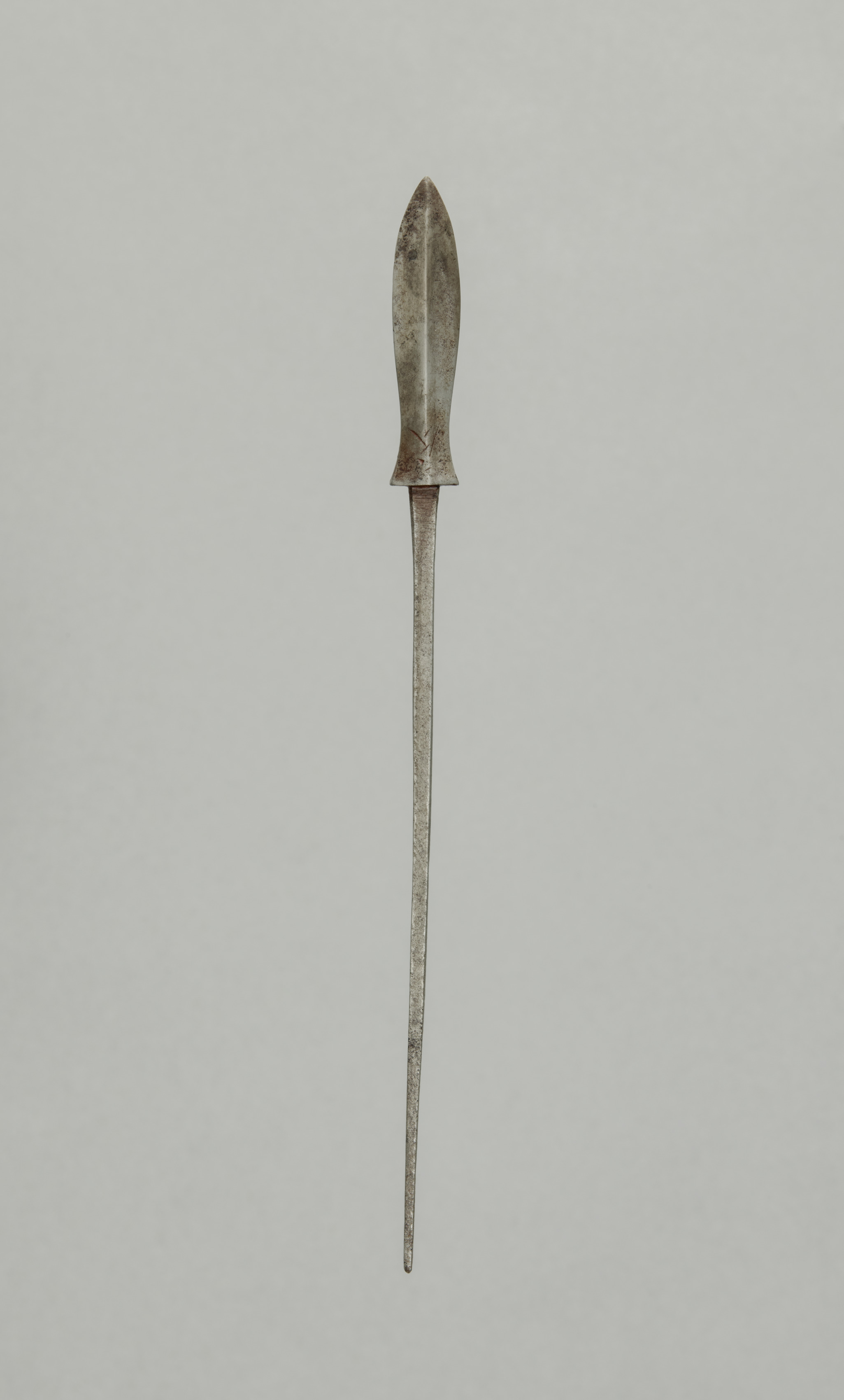 The image is of "Arrow Point" by an unknown artist. The image features a metal object with a long, thin shaft and a pointed tip. The object has a leaf-shaped metal piece at the top with a ridge down the center. A small collar connects the leaf-shaped piece to the shaft. The metal is gray with darker spots. The object is centered in the image against a light gray background.