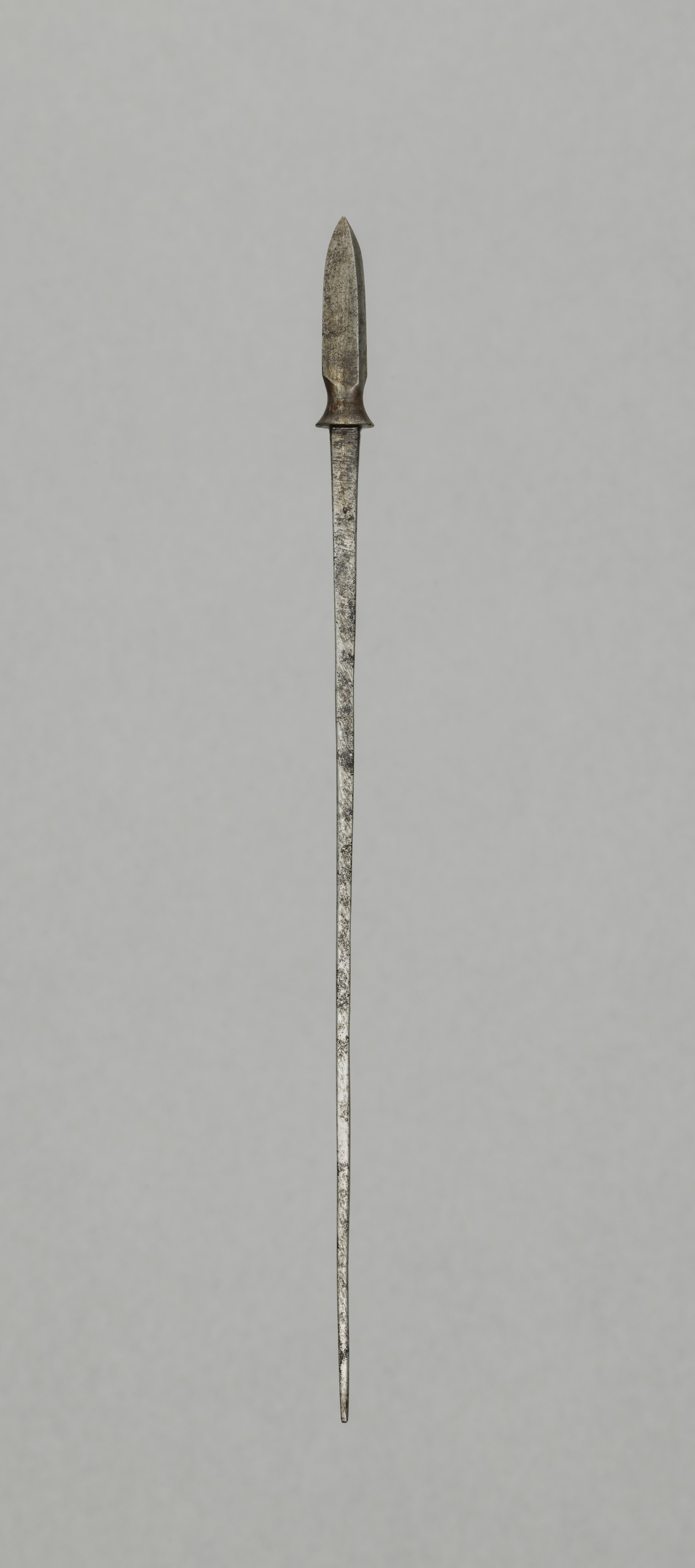 Metallic object with a long thin body that tapers to a point at both ends. The top end features a short triangular-shaped section that tapers to a point. Below this section, a short collar-like structure encircles the object's body. The object's surface displays visible signs of wear and corrosion. The object is set against a plain gray background. The object is titled "Arrow Point".