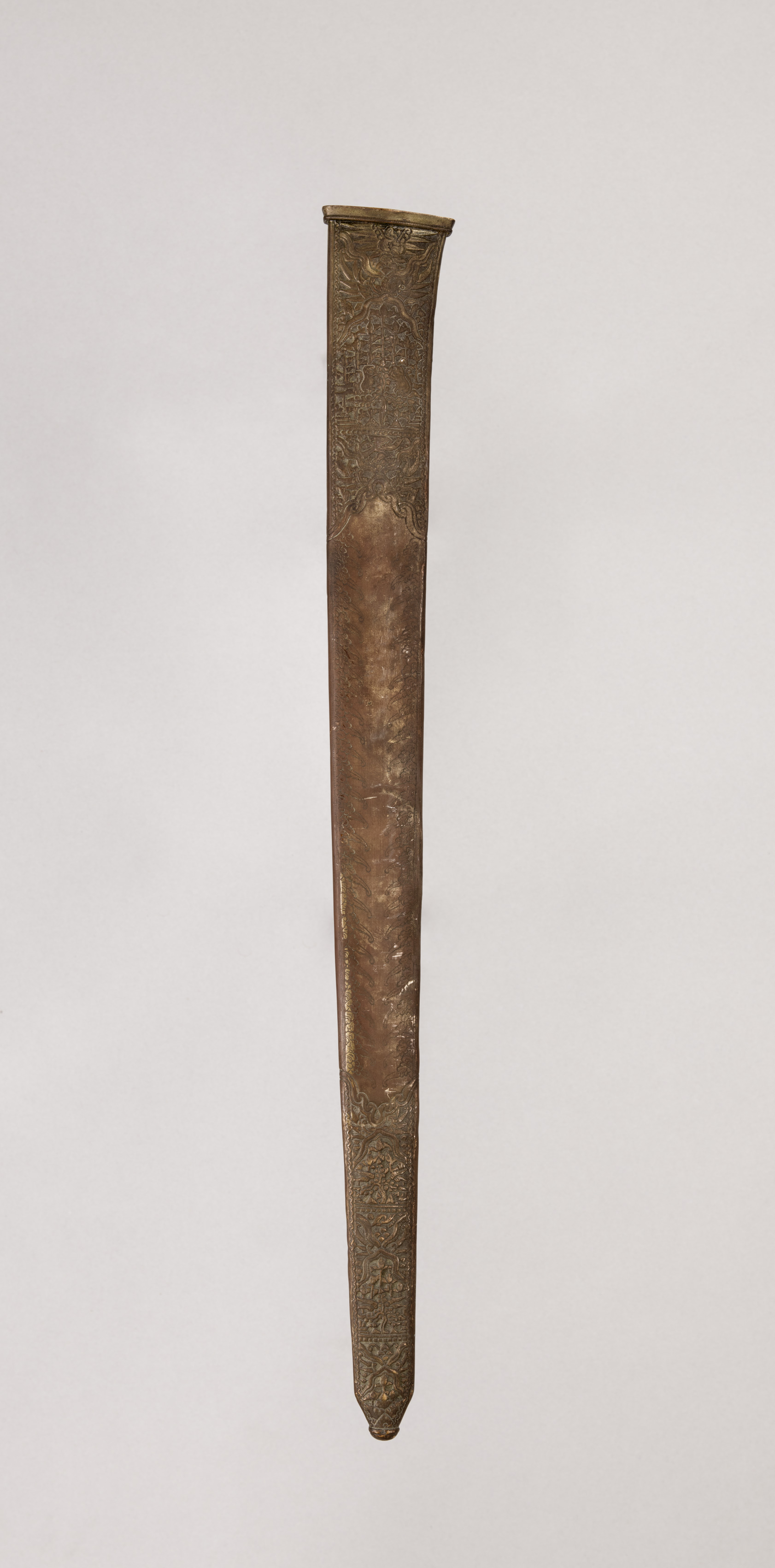 Long, narrow, bronze-colored scabbard with intricate designs and a pointed tip, made by artist Unidentified Artist, titled "Scabbard".