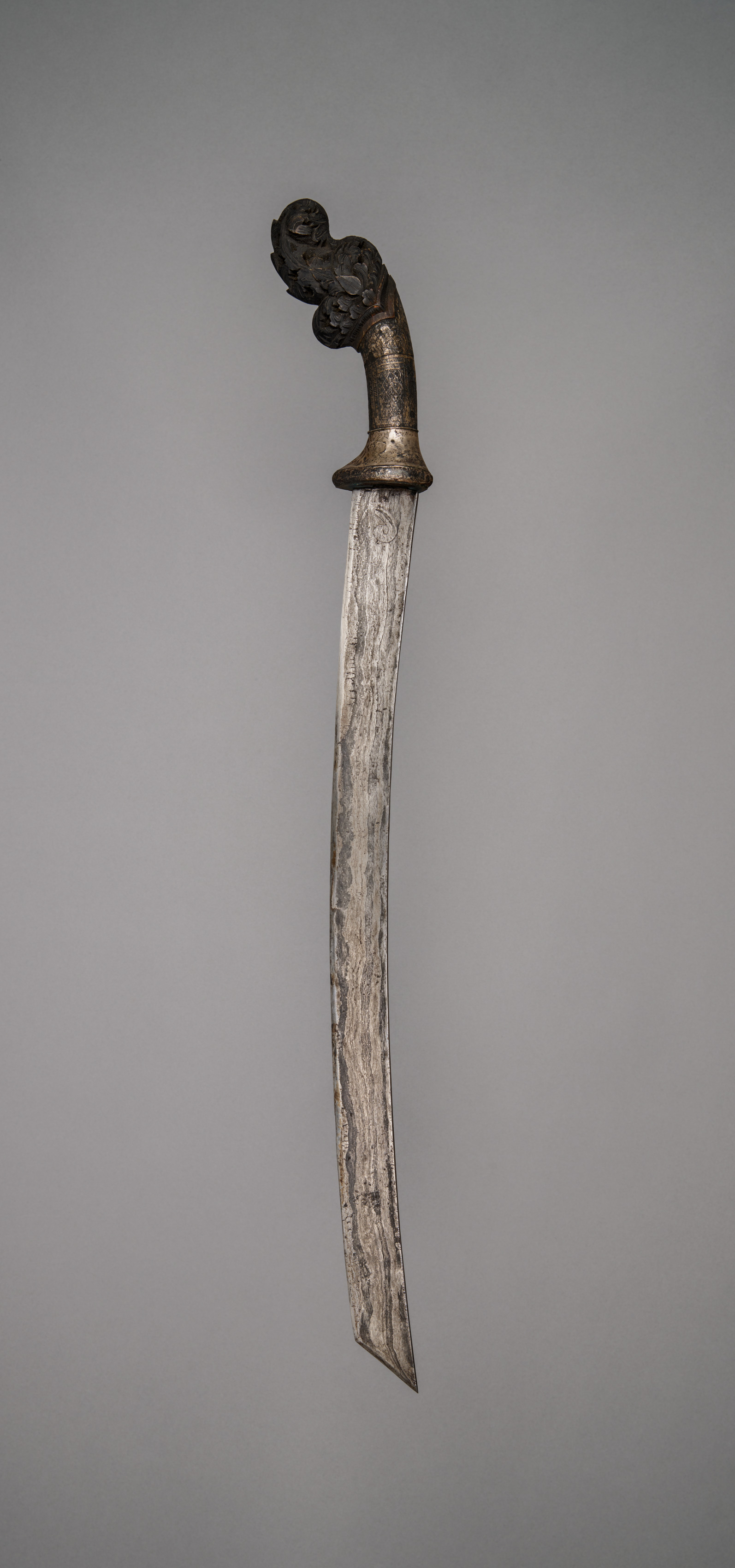 Sword by artist. Long, single-edged curved blade with a worn, weathered appearance. The blade is wider near the hilt and tapers to a point. The hilt is made of metal with a curved shape, featuring a distinctive finial at the top. The finial is composed of a series of connected, rounded shapes. The hilt's surface exhibits signs of wear and aging. The background of the image is a solid gray color.