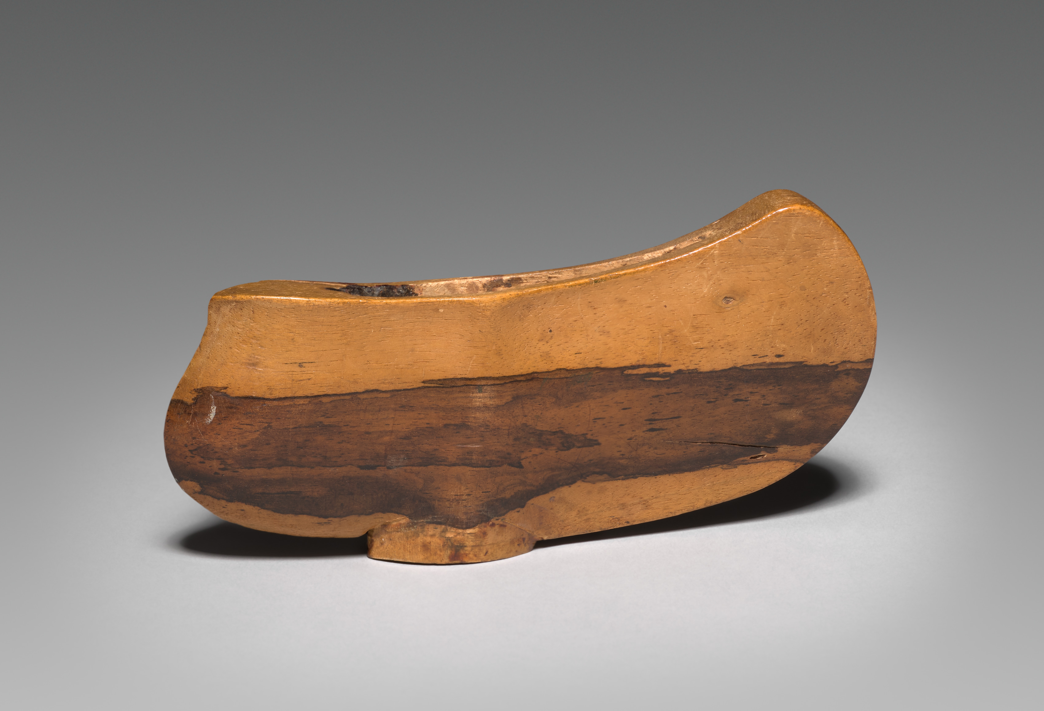 Wooden object, curved and asymmetrical; rounded rectangular base; rounded rectangular body with straight bottom; uneven; natural wood color with darker brown stripe around middle; several small dark spots; shadow on bottom and right; gradient gray background. Sword (Kris) by artist.