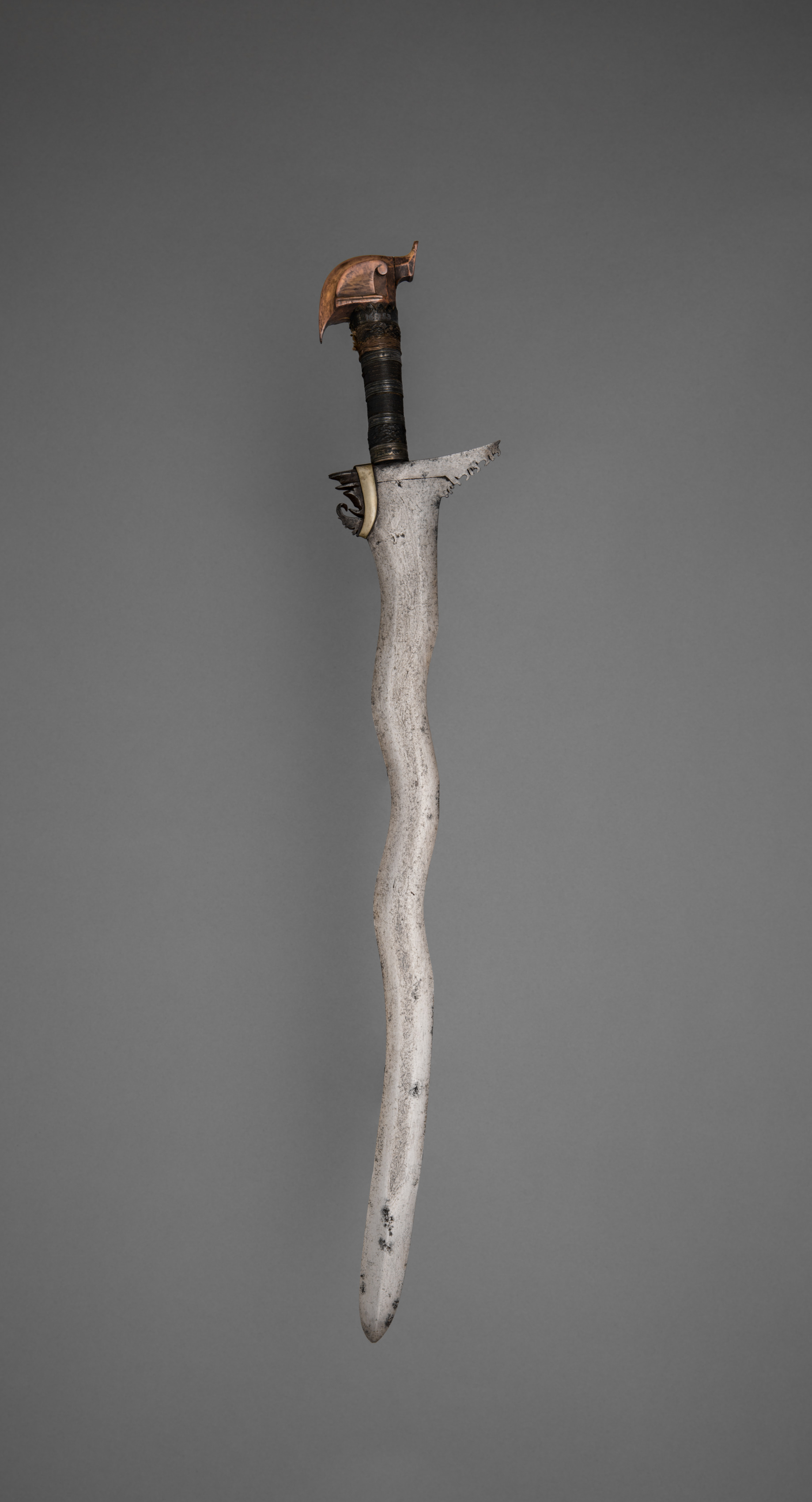 Sword with a wavy blade and a black wrapped hilt. The hilt has a copper-colored guard that curves downward. There is a small protrusion on the bottom of the guard. The pommel is not visible. The blade is mostly gray with some darker spots. The background is gray. Artist: Title: Kris (Sword).