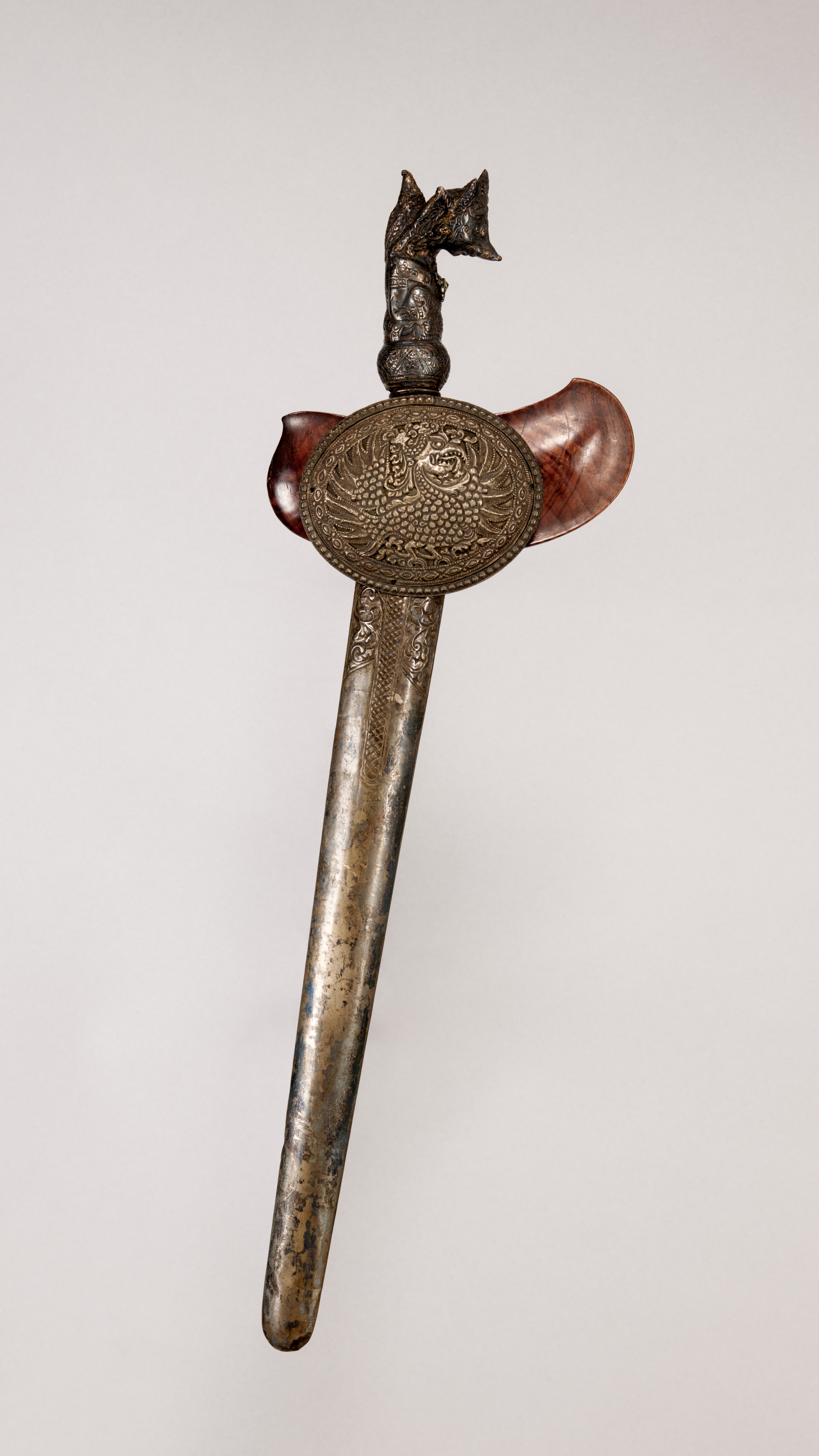 The sword has a long, narrow blade made of silver or a silver-colored metal. The blade is straight and tapers to a point. It has an etched pattern running along its length. The hilt is made of dark brown wood or leather and has a distinctive curved shape. A round metal plate with an etched design is at the base of the hilt. The pommel features a carved metal figure resembling a mythical creature. The background is a plain gray color. The title of the image is "Sword (Kris)" and the artist is unspecified.