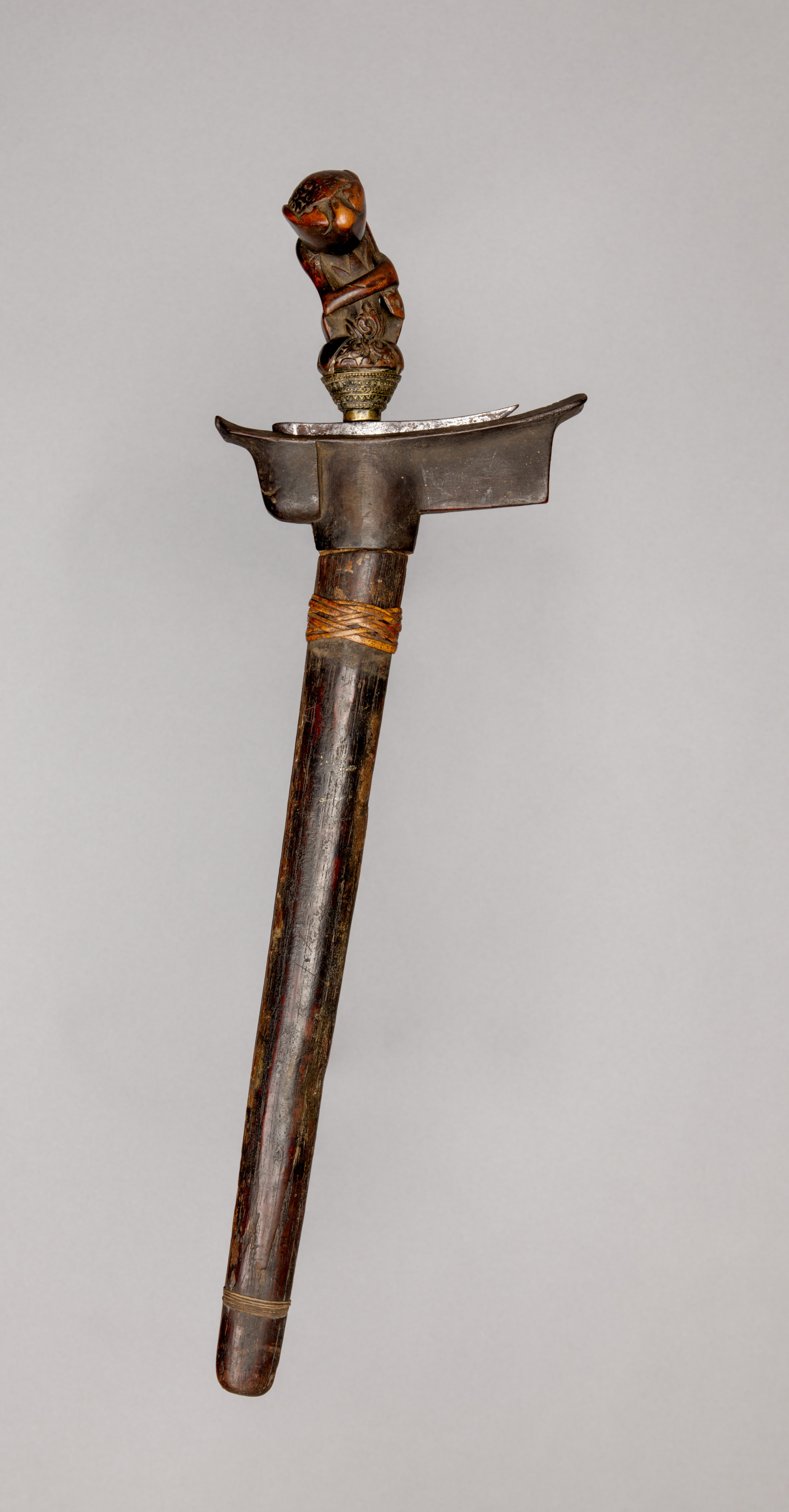 Sword (Kris) by an unknown artist. A sword with a long handle and a short blade. The handle appears to be made of dark wood. Wrapped around the handle are two thin strips of light brown string. The bottom of the handle is rounded. The top of the handle is connected to a brass or gold piece with etched designs. On top of the piece is a small sculpture of a human figure. The sword has a short, wide blade with a flat, asymmetrical shape. The blade and guard are made of a silver or gray metal. The background is a light gray color.