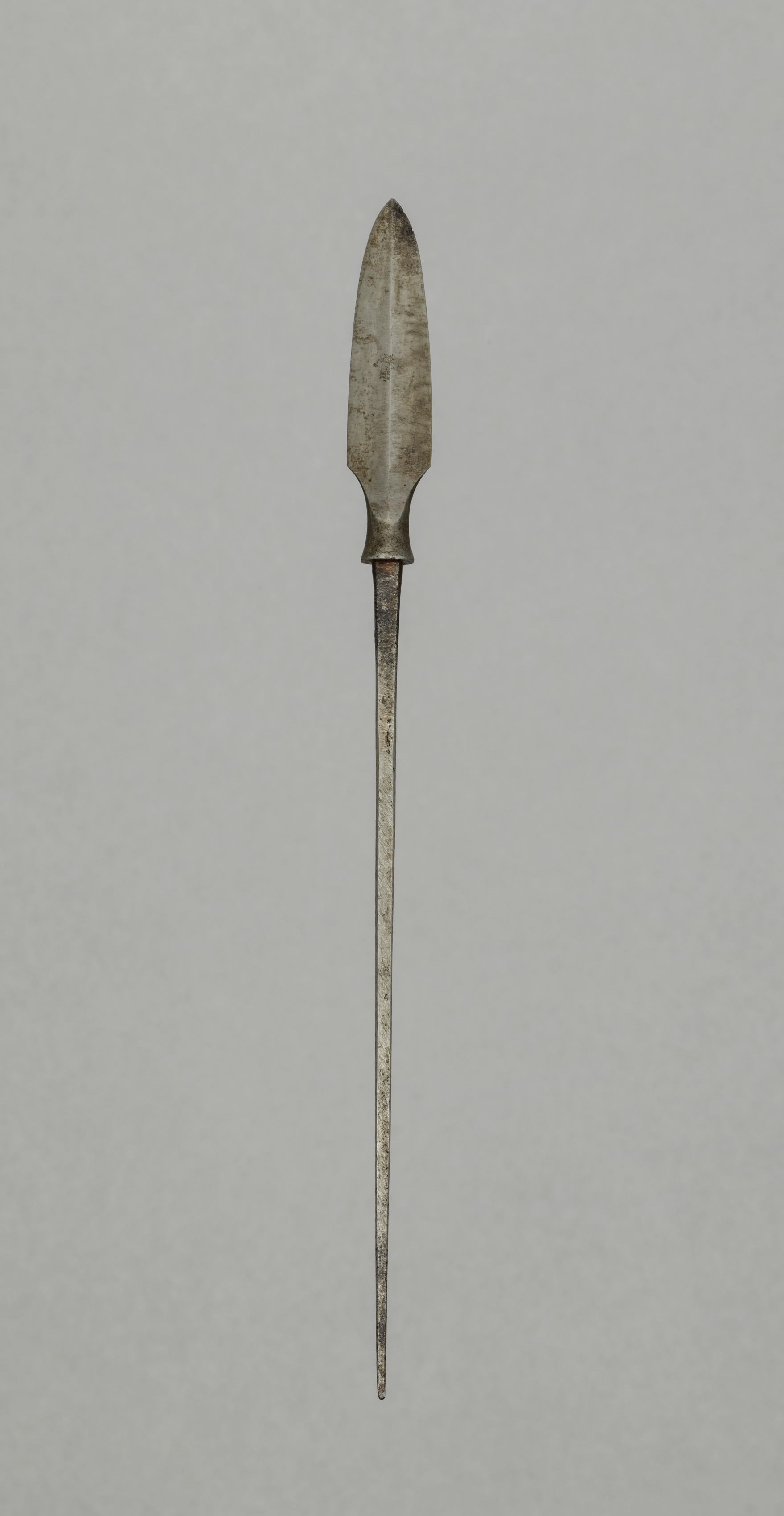 The image shows a spear point. The spear point is long and thin, with a pointed tip. The base of the point where it meets the shaft is slightly indented on both sides. The spear point appears to be made of metal, possibly bronze or copper. The spear point shows signs of aging, with a weathered appearance. The background of the image is a plain gray color. The title of the image is "Arrow Point". The artist is not visible. The image is likely a photograph. The spear point takes up most of the image. The spear point is centered in the image. The image contains no other objects.