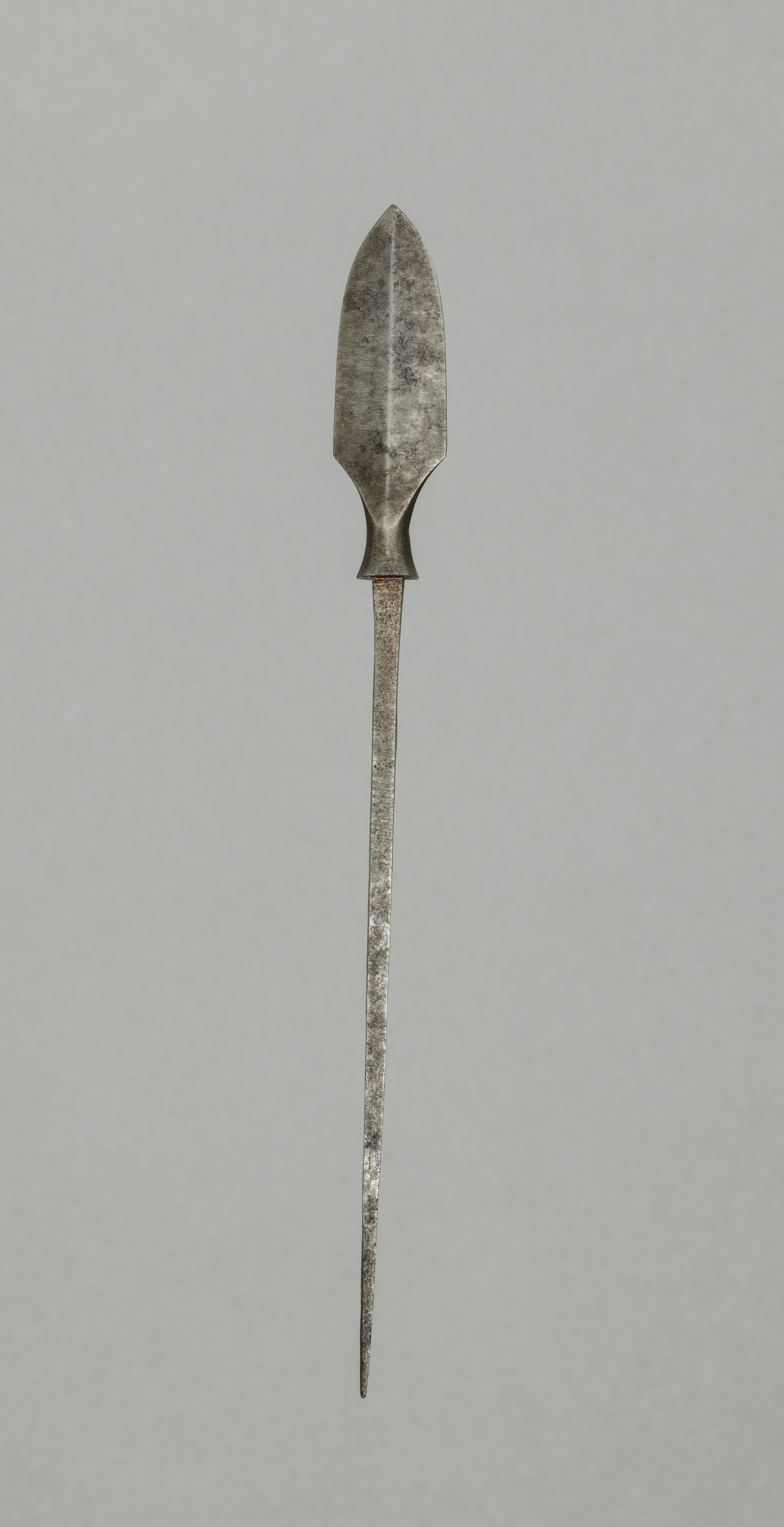Arrow Point by unknown artist. Metal object with a long, thin, pointed end and a wider, flat end. The object is metallic gray with visible signs of wear and corrosion all over. The long, thin end tapers to a point. The wider end is leaf-shaped with a slight curve on both sides near the pointed end. The object is centered in the image. The background is a flat, light grey color.
