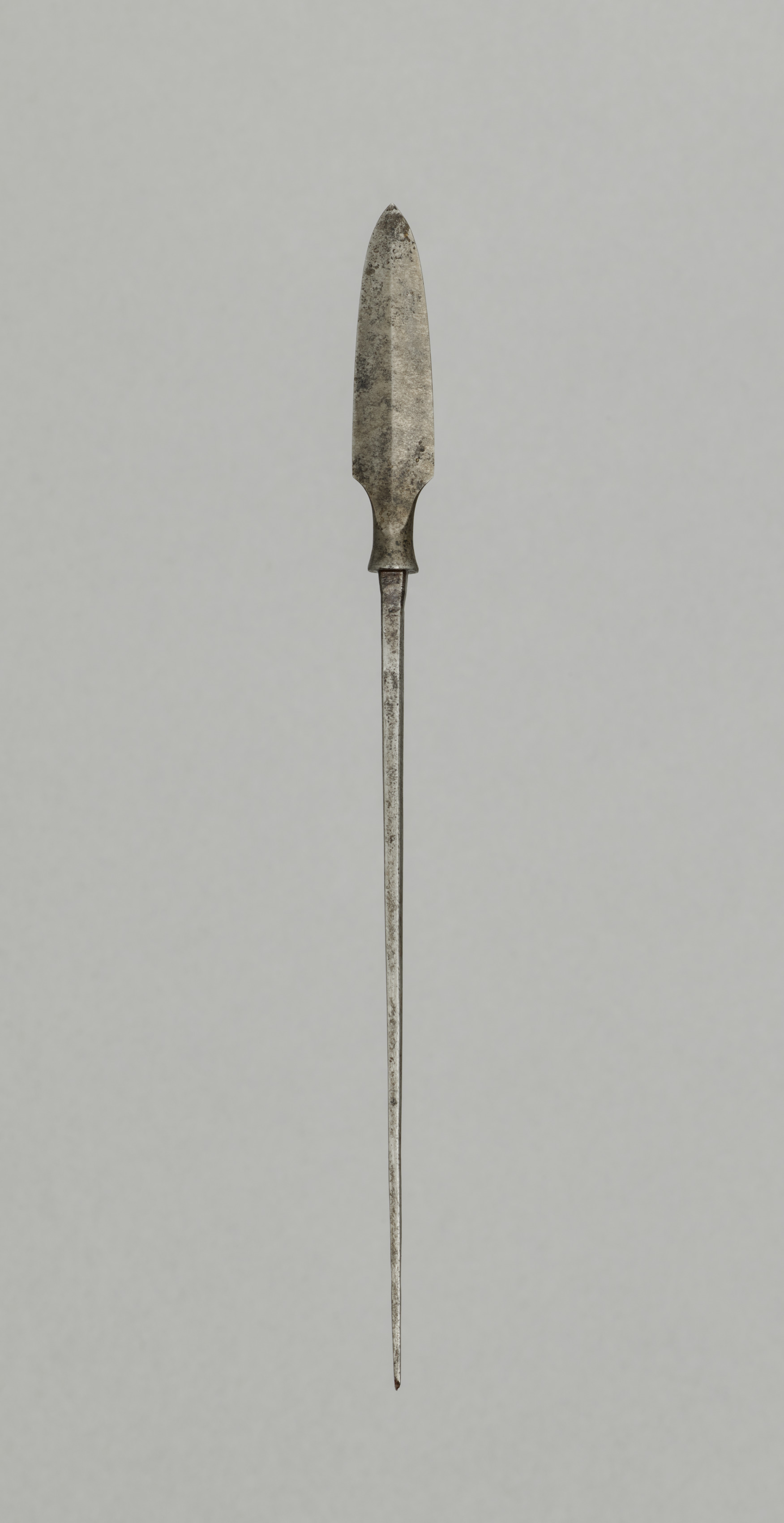 The artwork titled "Arrow Point" by an unknown artist depicts a long, thin, metallic object with a tapered point at one end. The object has a narrow, elongated shaft that tapers to a sharper tip at the bottom. The top portion of the object tapers to a more blunt tip. The object appears to be made of metal and exhibits signs of wear and aging, with visible discoloration and texture along its surface. The background of the image is a solid light gray color.