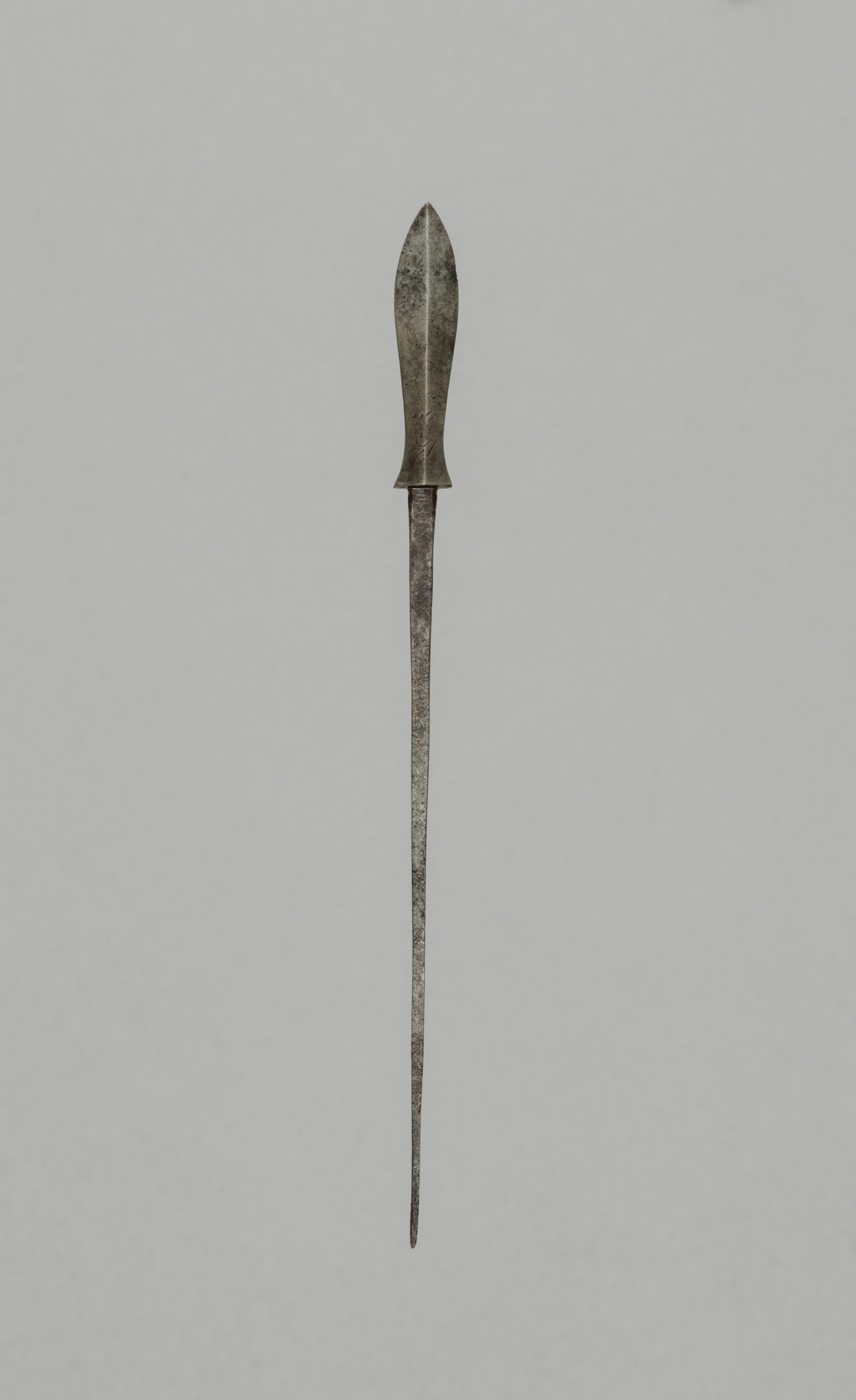 Long, thin dagger with a short hilt; metal; pointed tip; worn; gray; Arrow Point; No Artist Specified is removed since no artist was provided; dagger only; long profile view.
