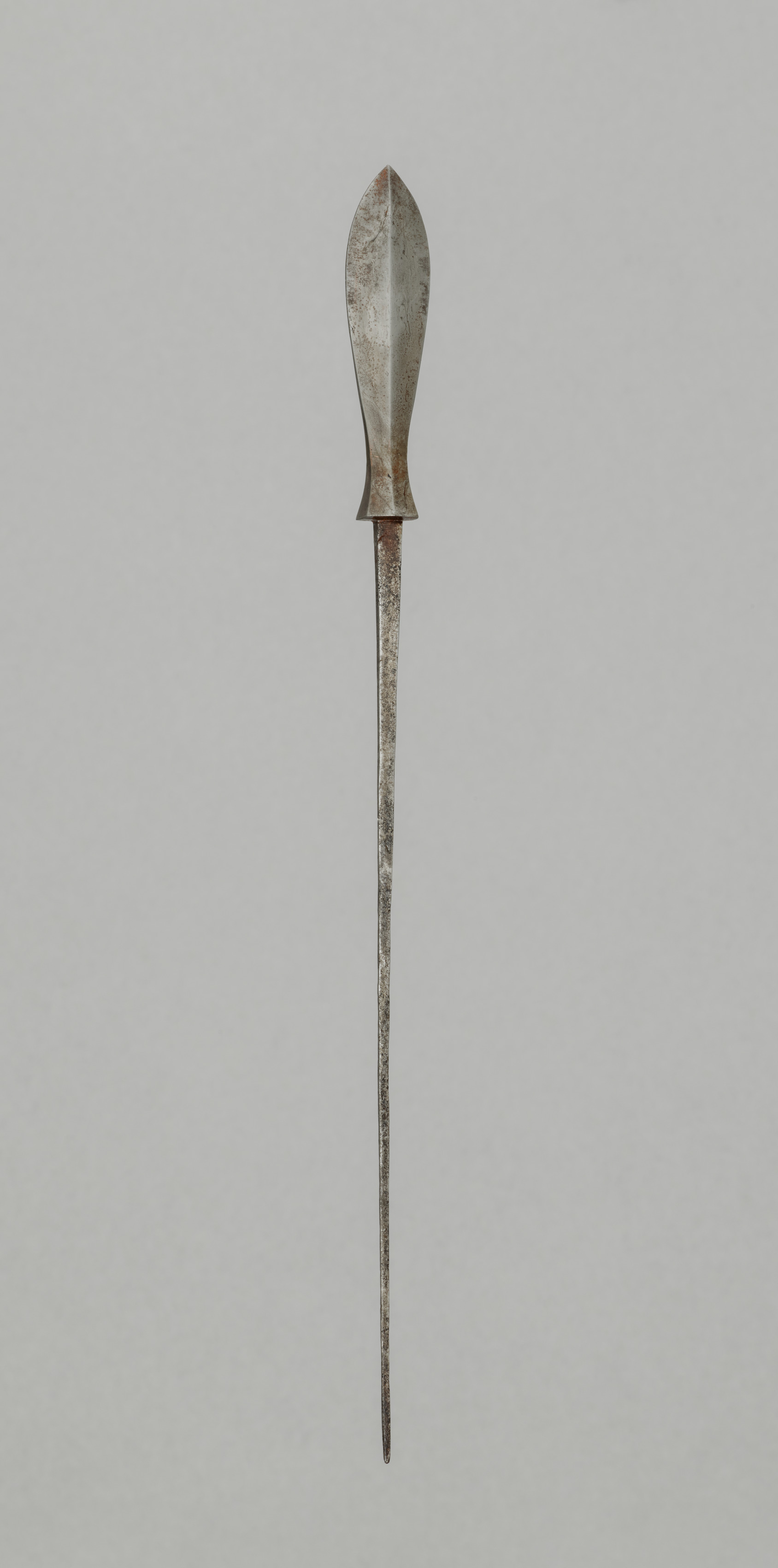 The image depicts a long, thin object with a pointed tip, titled "Arrow Point" by an unnamed artist. The object has a metallic appearance with a silver-gray color and visible signs of rust or corrosion. The top part of the object is shaped like a leaf or a spearhead, with a narrow neck connecting it to the long, thin shaft. The shaft is straight and tapers to a point at the bottom. The object is centered in the image against a plain gray background. The image is likely a photograph of an archaeological or historical artifact.