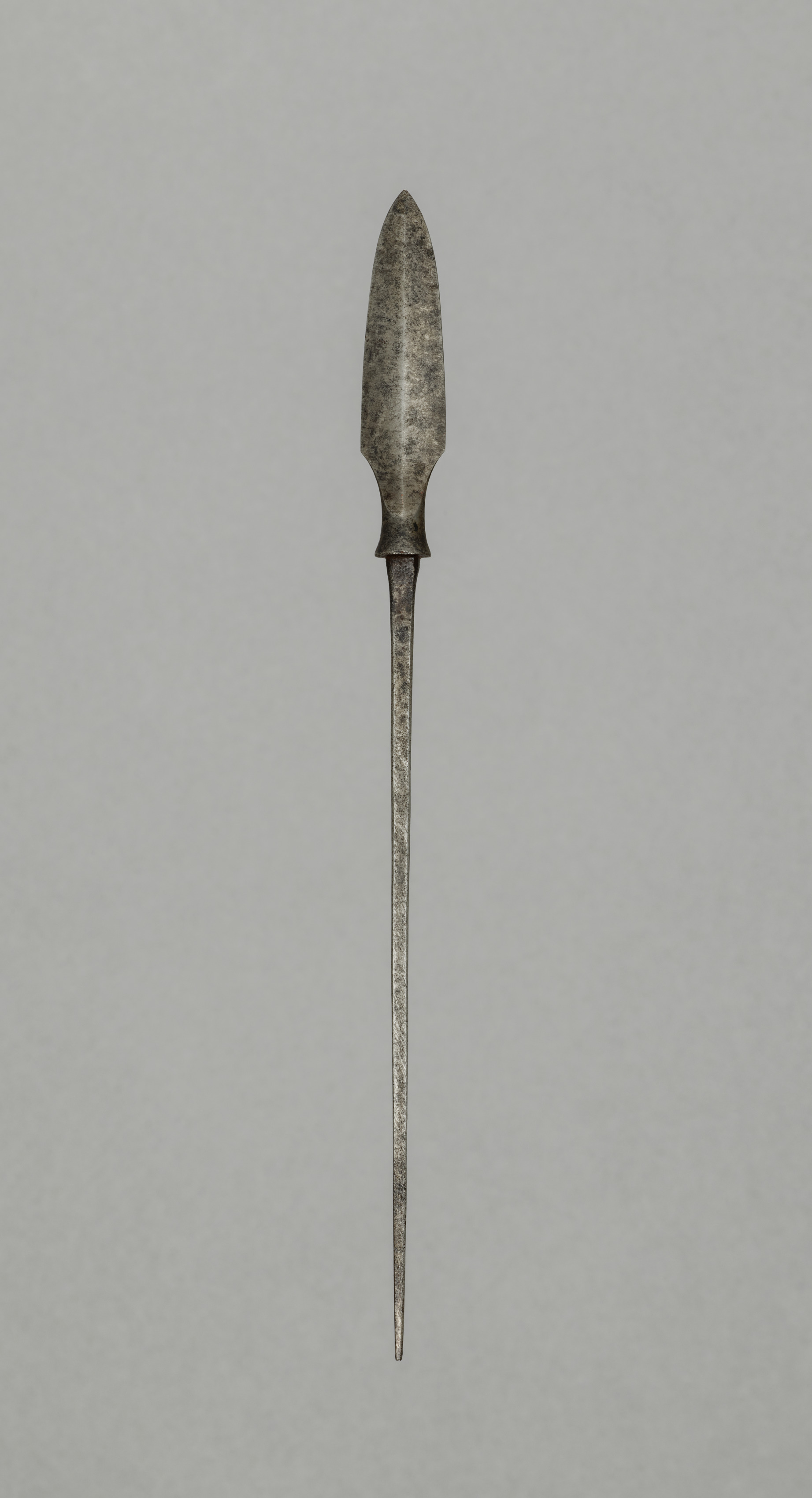 The image depicts Arrow Point by an unknown artist. The object in the image is a long, thin, pointed tool made of metal. The tool has a broad tip narrowing to a point. A thin, raised ridge runs along the center of the point on both sides. The handle joins the point at a narrow neck. The handle tapers to a point. The handle and point are made from a single piece of metal with similar texture and color, suggesting they were cast or forged together. The background of the image is gray. The object is centered on the image.