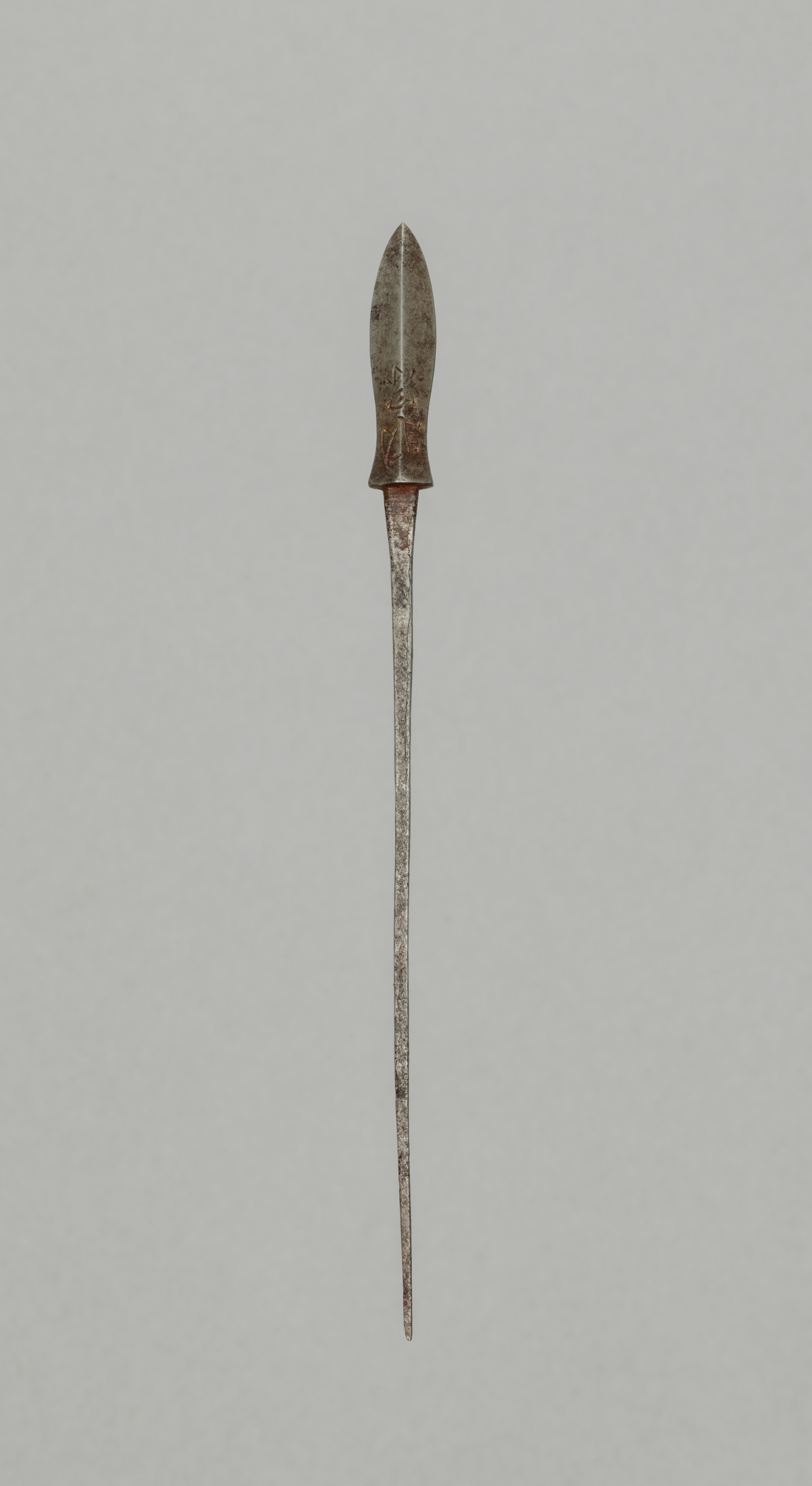The image shows Arrow Point by an unknown artist. The object is long and thin with a pointed tip. The top section is wider and also tapers to a point. The metal is dark gray with areas of lighter gray and orange. The object tapers from the middle to the bottom and the tip is very narrow. The background is a solid light gray color.