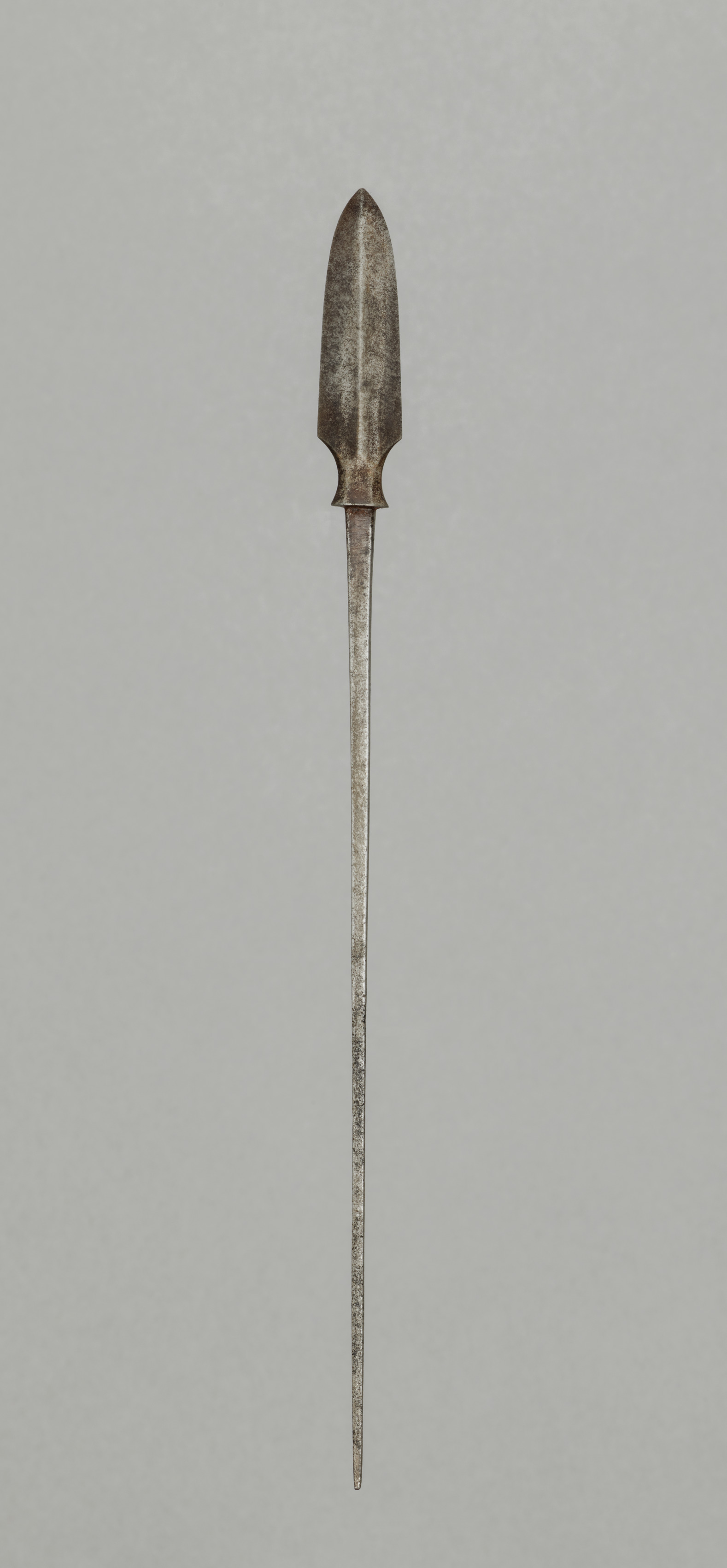 The image titled "Arrow Point" by an unknown artist depicts a long, thin, pointed metal object. The object has a broad, flat, and triangular tip resembling a leaf. A short, narrow collar or ridge is located just below the tip. The long, thin shaft tapers to a sharp point at the bottom. The metal object appears weathered or corroded with a dull gray color. The background of the image is a plain gray color.