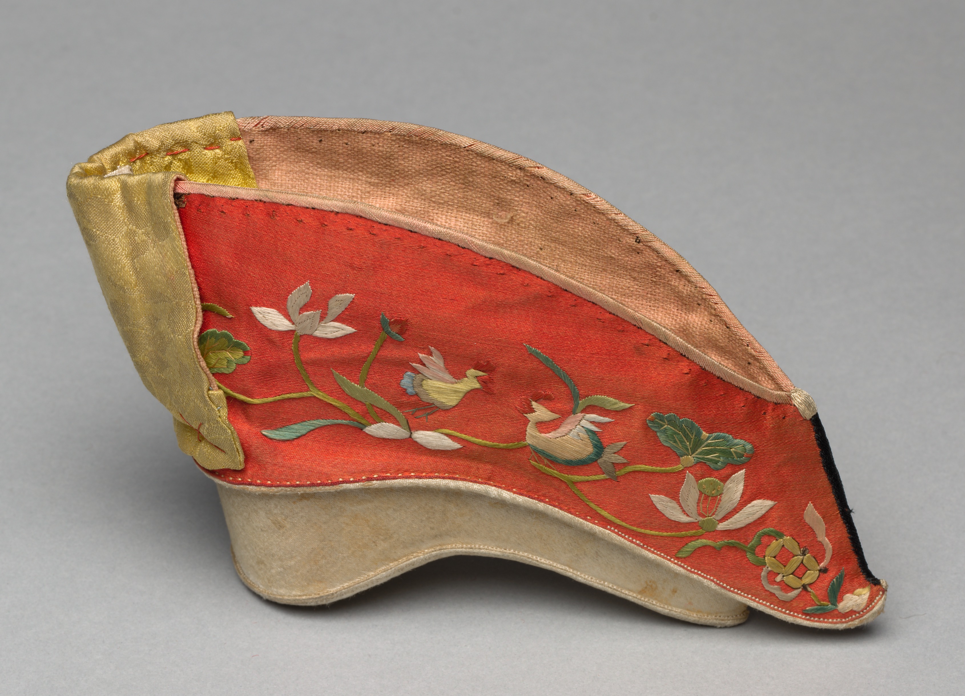 Red shoe with a floral design and birds; gold fabric on the heel; beige sole and interior; visible stitching around the edges; low heel; pointed toe; primarily red upper with gold, green, white, and blue details. Title: Shoe Artist: Unknown