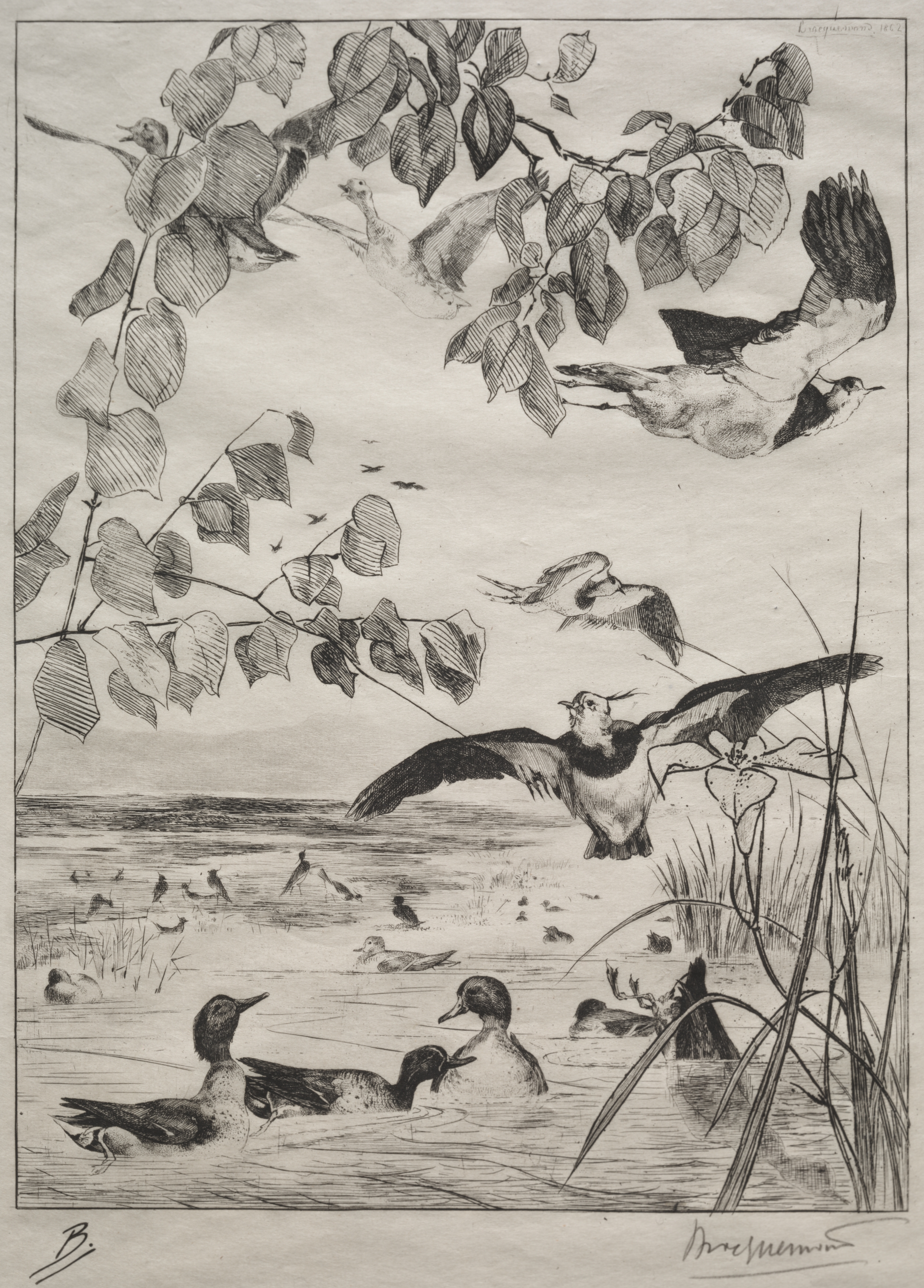Black and white image. Birds in water and flying. Some birds have white and black bodies and some have darker bodies. A tree branch with leaves arcs across the top. A body of water covers most of the bottom half. Land visible on the horizon. Birds in flight have wings spread. Some birds are swimming or standing in water. Signature in bottom right corner. Small writing in top right corner. Small signature in bottom left corner. Search for Lapwings and Teals by Félix Bracquemond.