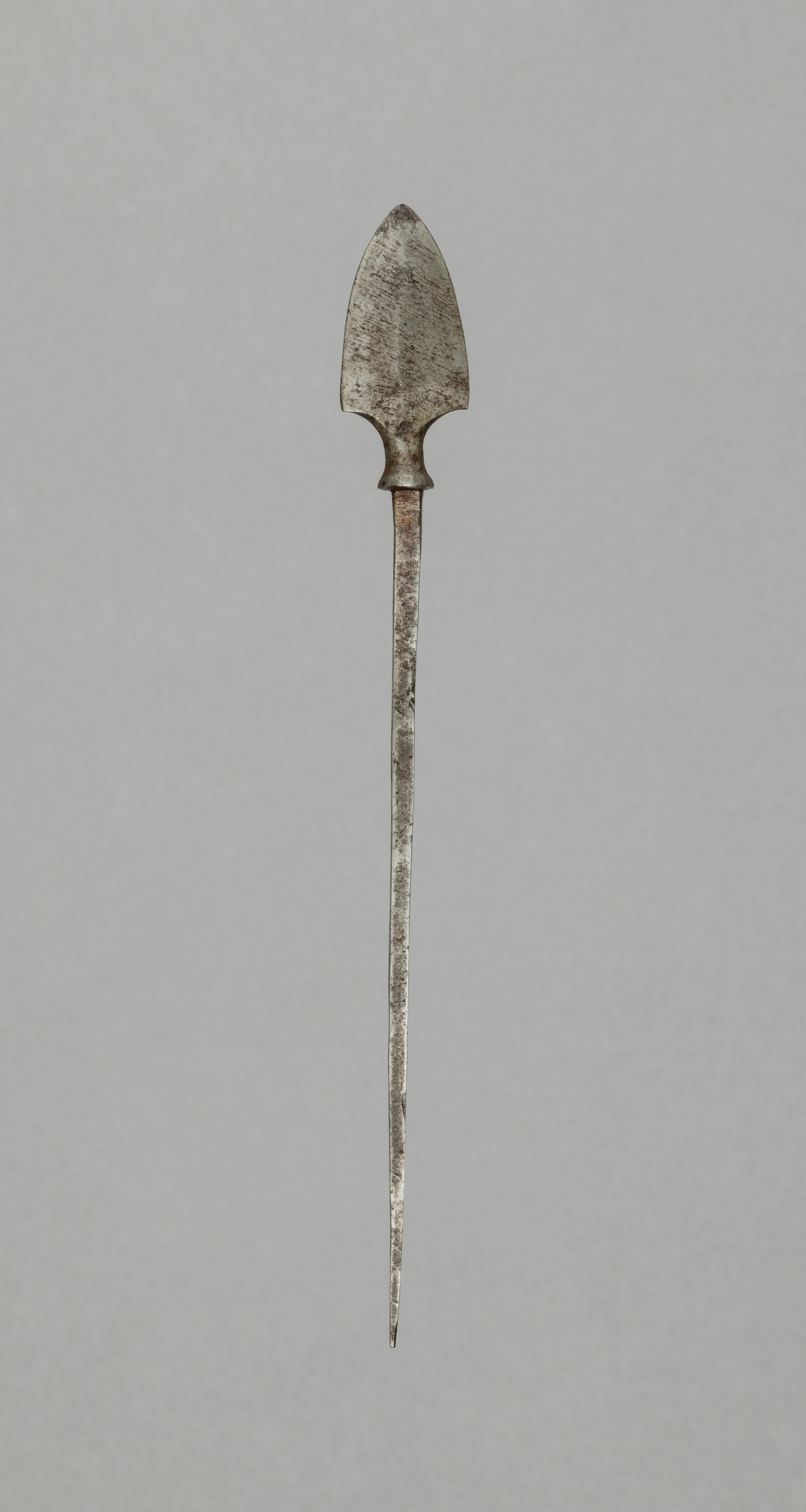 The image titled "Arrow Point" by the artist depicts a long, thin, pointed metal object. The object has a broad, triangular head that tapers to a point at the top and a narrower, cylindrical section at the bottom. A small, raised section connects the head to the long, thin shaft. The metal is weathered and corroded, with visible signs of wear and tear. The background of the image is a solid gray color.