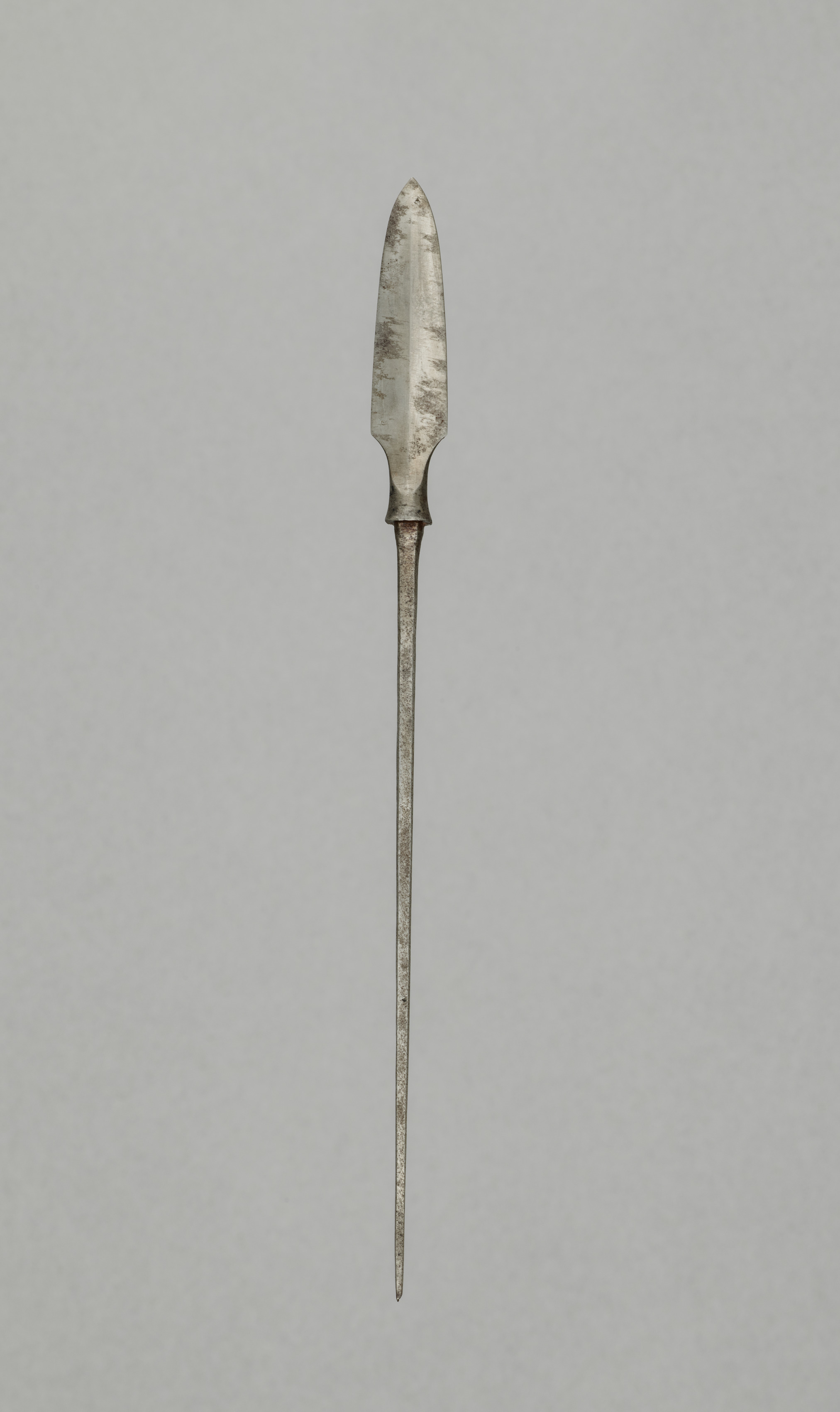 The image depicts an ancient metal object titled "Arrow Point" by an unspecified artist. The object is long and thin, made of a silver-colored metal with a darker patina. The top part is wider and tapers to a point, resembling a triangular shape. The bottom part is narrower and tapers to a sharp point. The object has a slight narrowing at the base of the wider top part, before tapering down. The background of the image is a solid light gray color. The object appears to be displayed against a plain backdrop. The object is centered in the image.