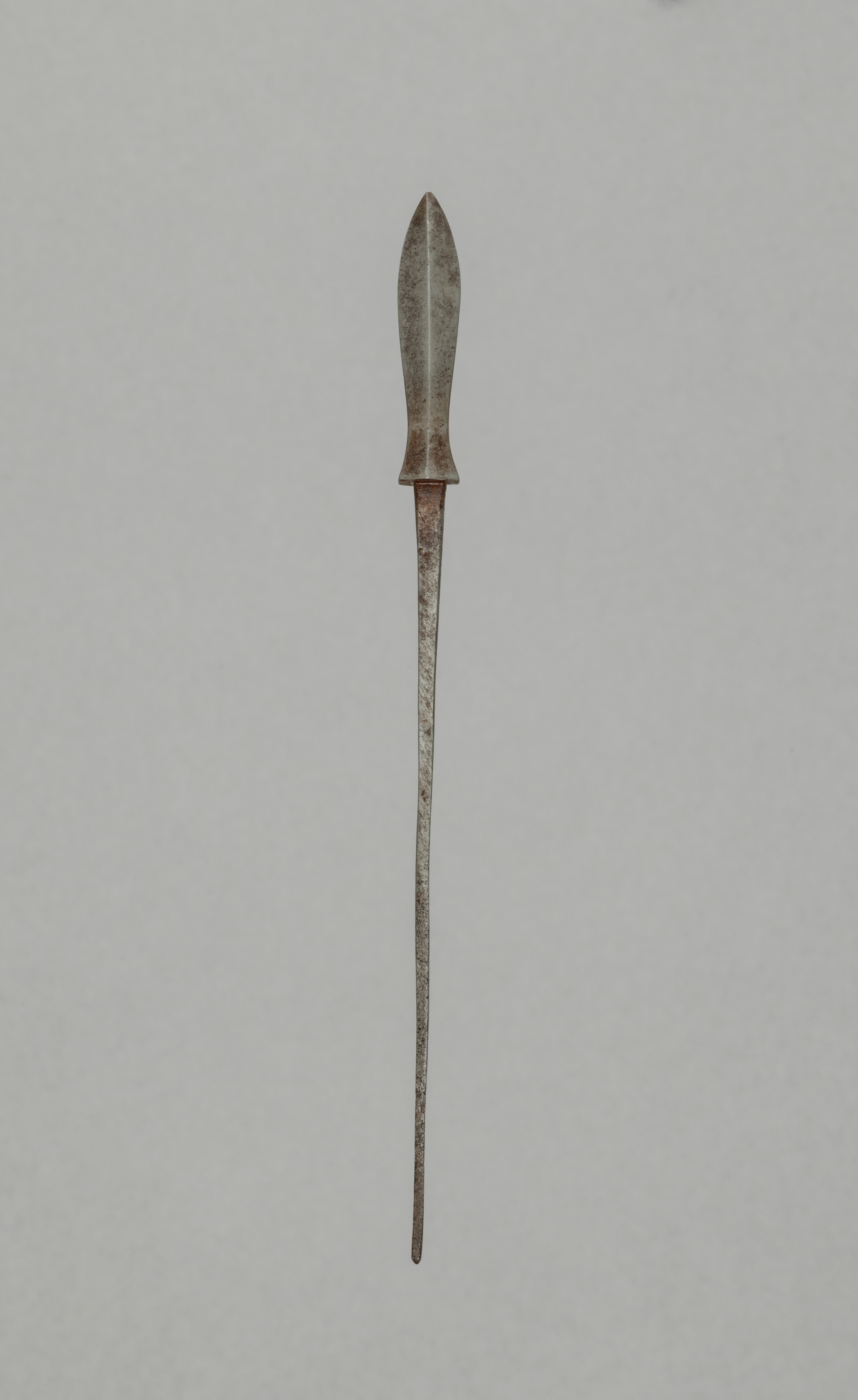 Metallic gray-colored dagger with a copper-colored area on the handle; blade tapers to a point; shown against a flat gray background. Arrow Point.