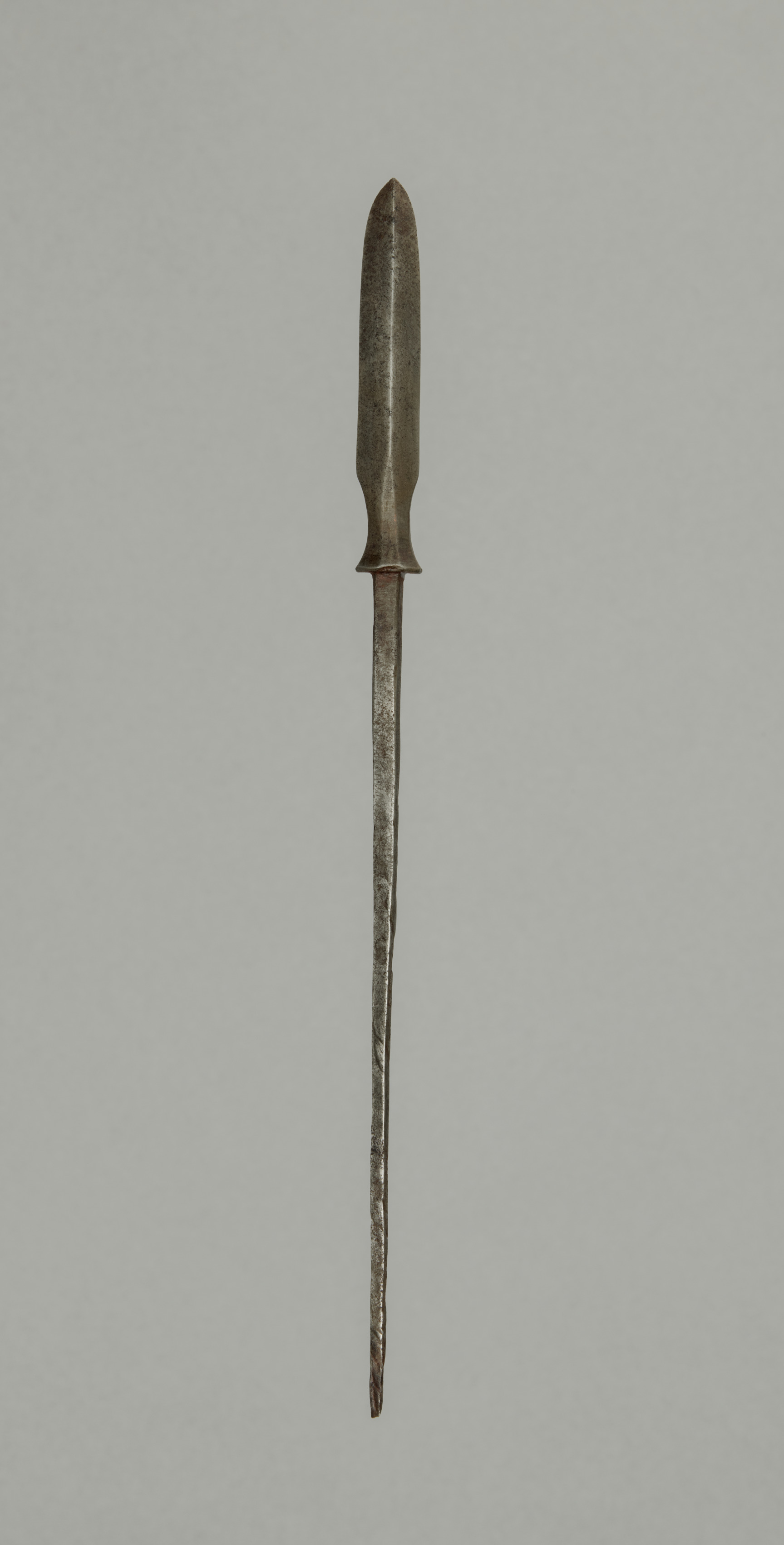 The image shows "Arrow Point" by an unknown artist. The object is a long, thin, pointed metal tool. The top is thicker and tapers to a point. The top section is about one-third of the way down and has a slight narrowing just below it. The lower two-thirds are thinner and more tapered with a slight bend to the right near the bottom. The metal appears to have a dark gray patina with lighter gray and white spots. The background is a solid light gray color.