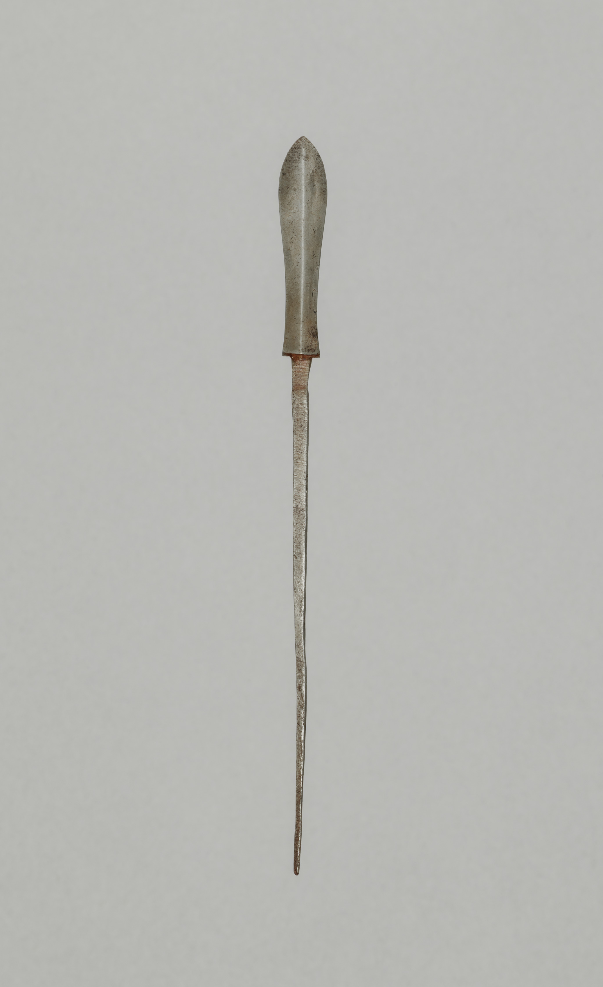 Metal arrow point with a narrow, elongated triangular blade and a pointed tip. The blade is long and thin, tapering to a point at the end. The base of the blade is wrapped with tan-colored material, possibly leather or cord. The background is a plain gray color. The title of the image is "Arrow Point".