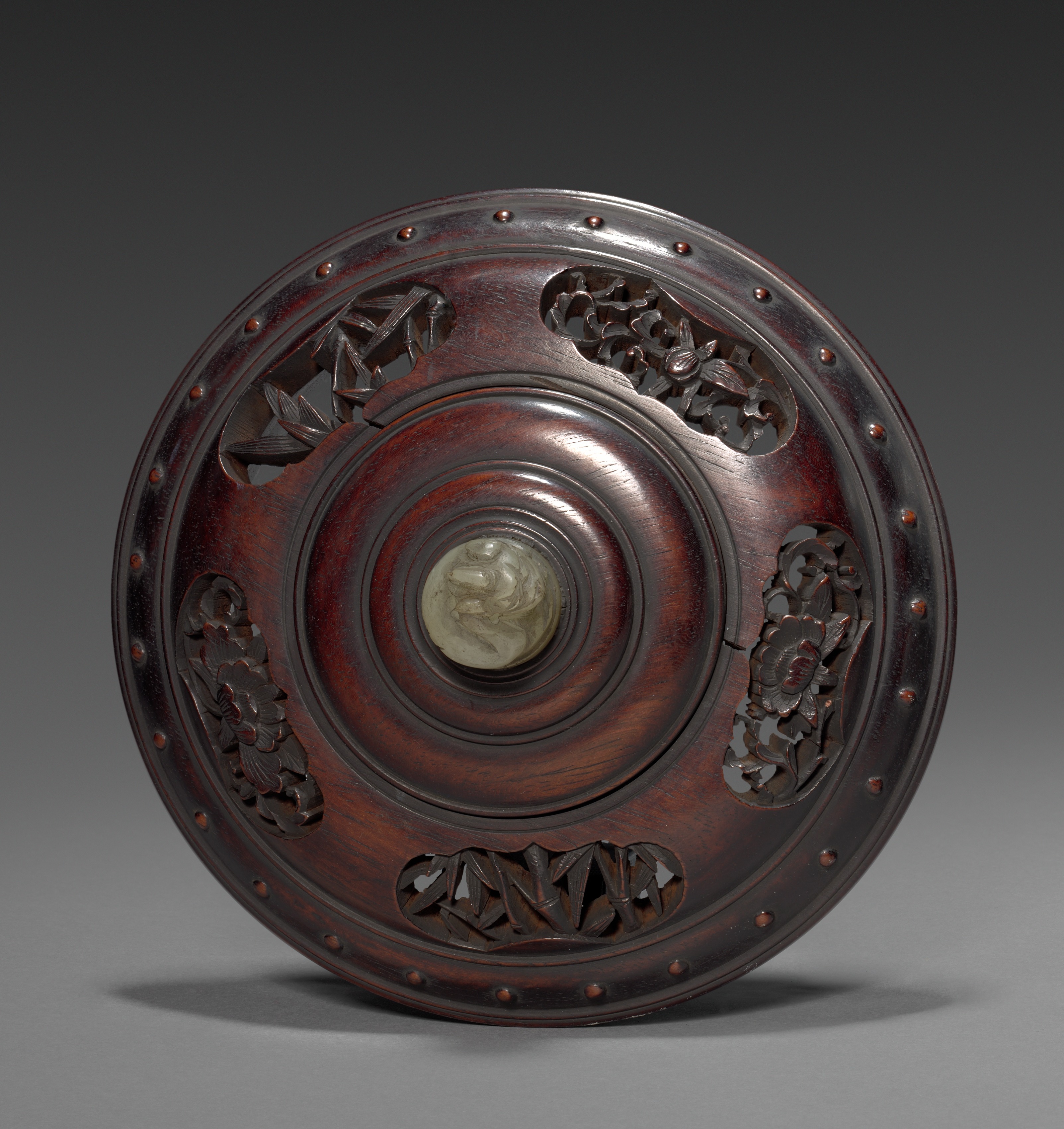 Round wooden lid with dark brown color. The lid features a circular design with a raised edge adorned with small dots. A carved circular pattern around the center. The center contains a circular white stone with an engraved design. The lid has four carved floral designs, one on the top right, one on the bottom right, and two on the left side. The background of the image is dark gray.