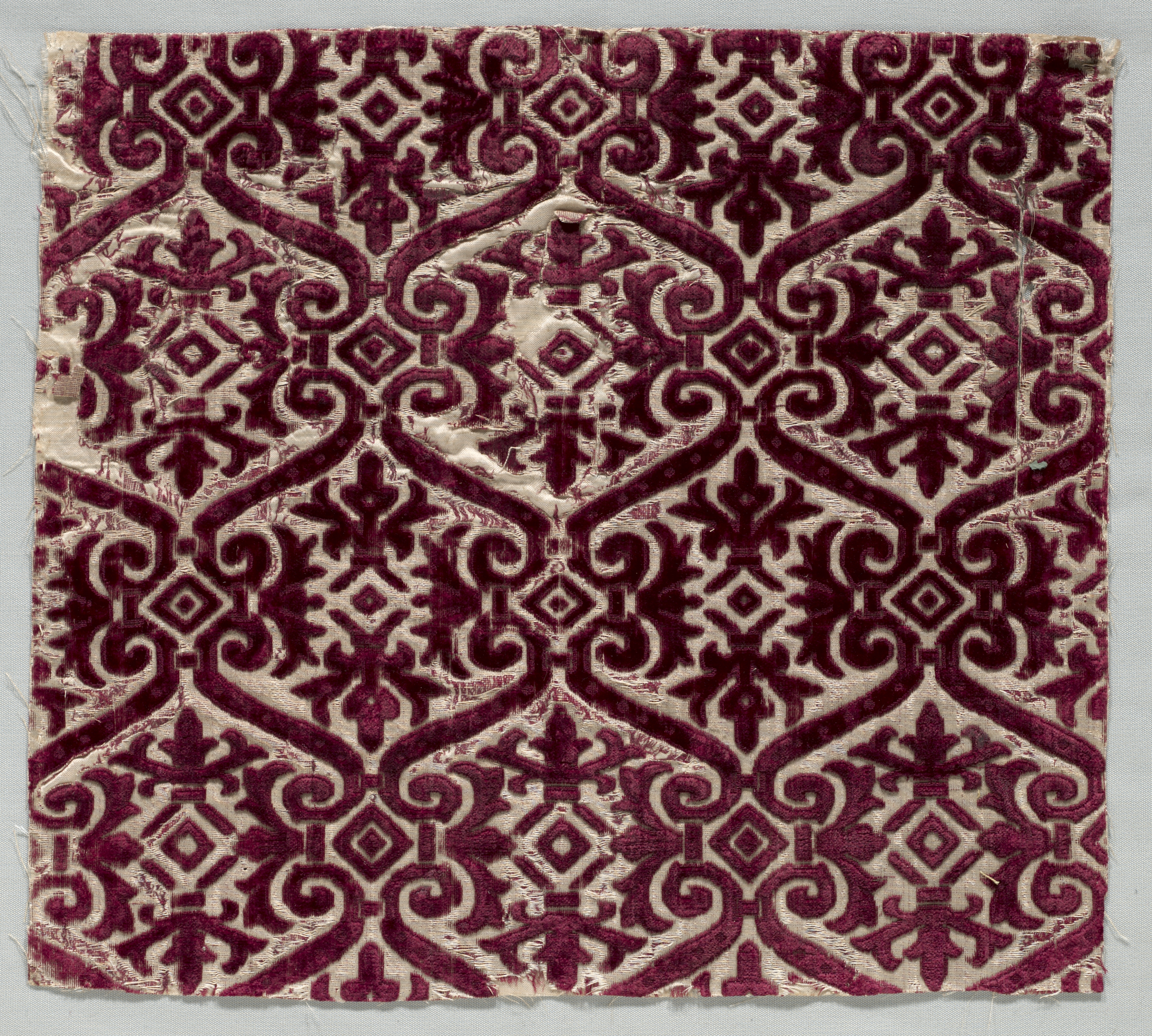 Velvet brocaded textile by artist, title not modifying, described as: A square piece of fabric with a repeating pattern of maroon and cream-colored designs. The design features diamond shapes with curved lines and swirls, arranged in a symmetrical and repeating pattern. The maroon color is a deep, rich shade, while the cream color provides a neutral background. The fabric has a velvety texture, with a subtle sheen. The edges of the fabric are rough and frayed. The background behind the fabric is light gray.
