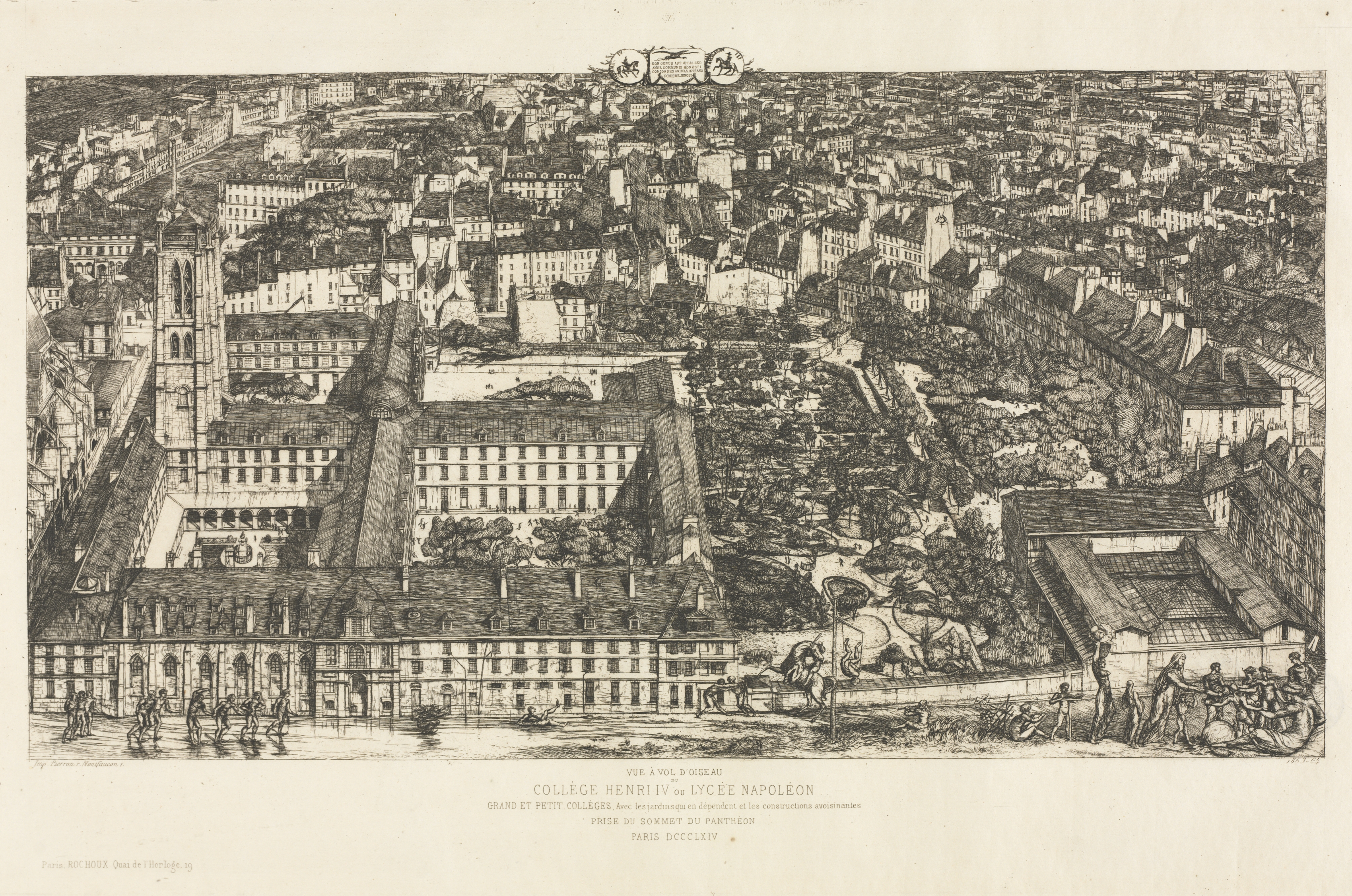 The image depicts a bird's-eye view of a large college or university building complex surrounded by a city. The complex consists of several connected buildings with dark roofs and white walls, featuring many windows. A courtyard with trees is visible within the complex. The buildings are situated along a river or canal, with a bridge or walkway on the right side. People are shown engaging in various activities outside the complex, such as walking or gathered around a statue. The surrounding cityscape is densely populated with numerous buildings, trees, and streets. The image is rendered in black and white, with detailed line work and shading. The title "College Henri IV" and the artist's name "Charles Meryon" are associated with the image. The text at the bottom of the image is in French. The overall scene presents a detailed and historic view of the college and its surroundings.